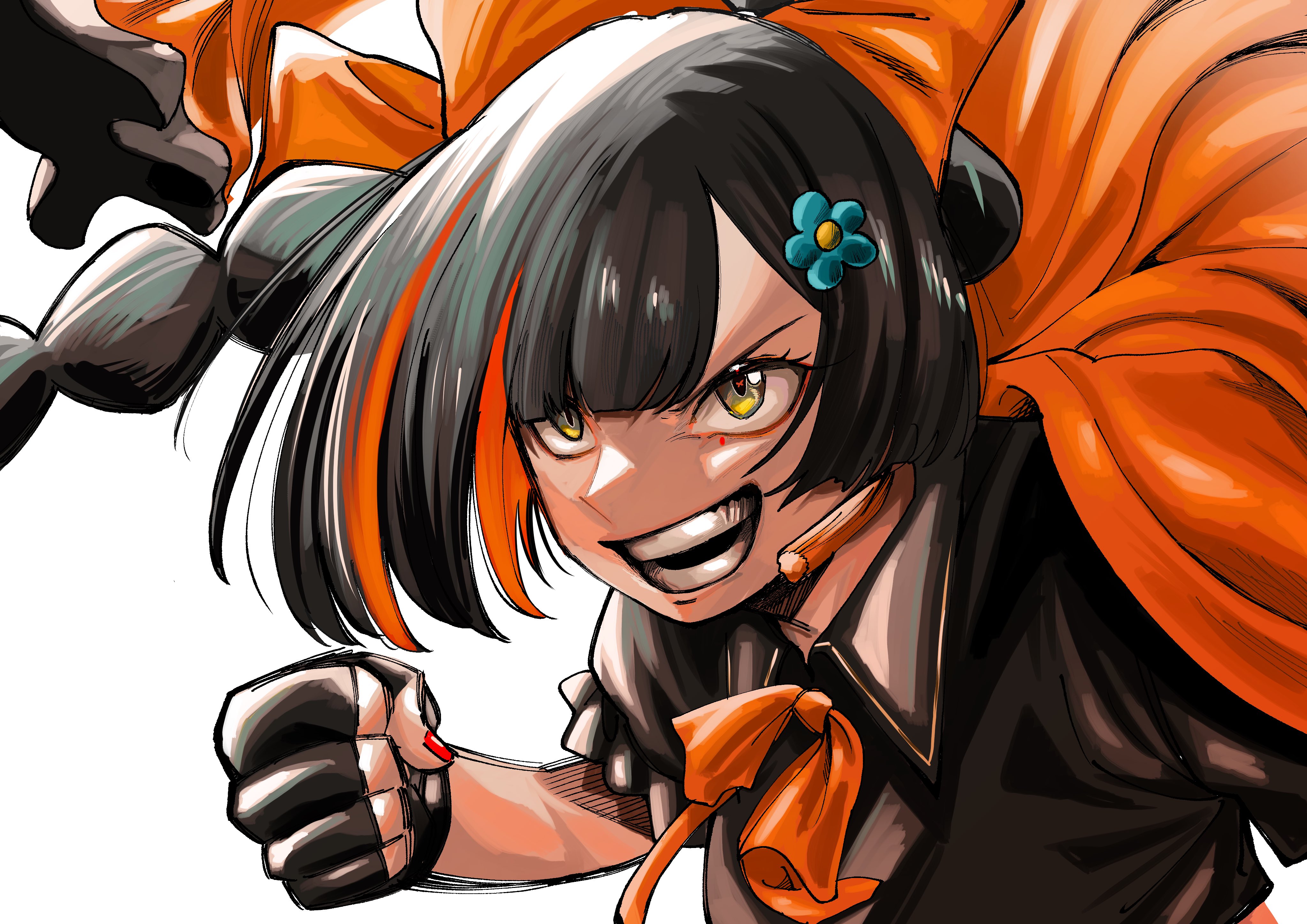 1girl absurdres black_gloves black_hair black_shirt bow bowtie choya_hanabi choya_hanabi_(1st_costume) commentary_request fingerless_gloves flower gloves hair_flower hair_ornament highres kou_hei_(takasr_kou) multicolored_hair open_mouth orange_bow orange_bowtie orange_hair shirt solo streaked_hair teeth two-tone_hair virtual_youtuber vspo! yellow_eyes