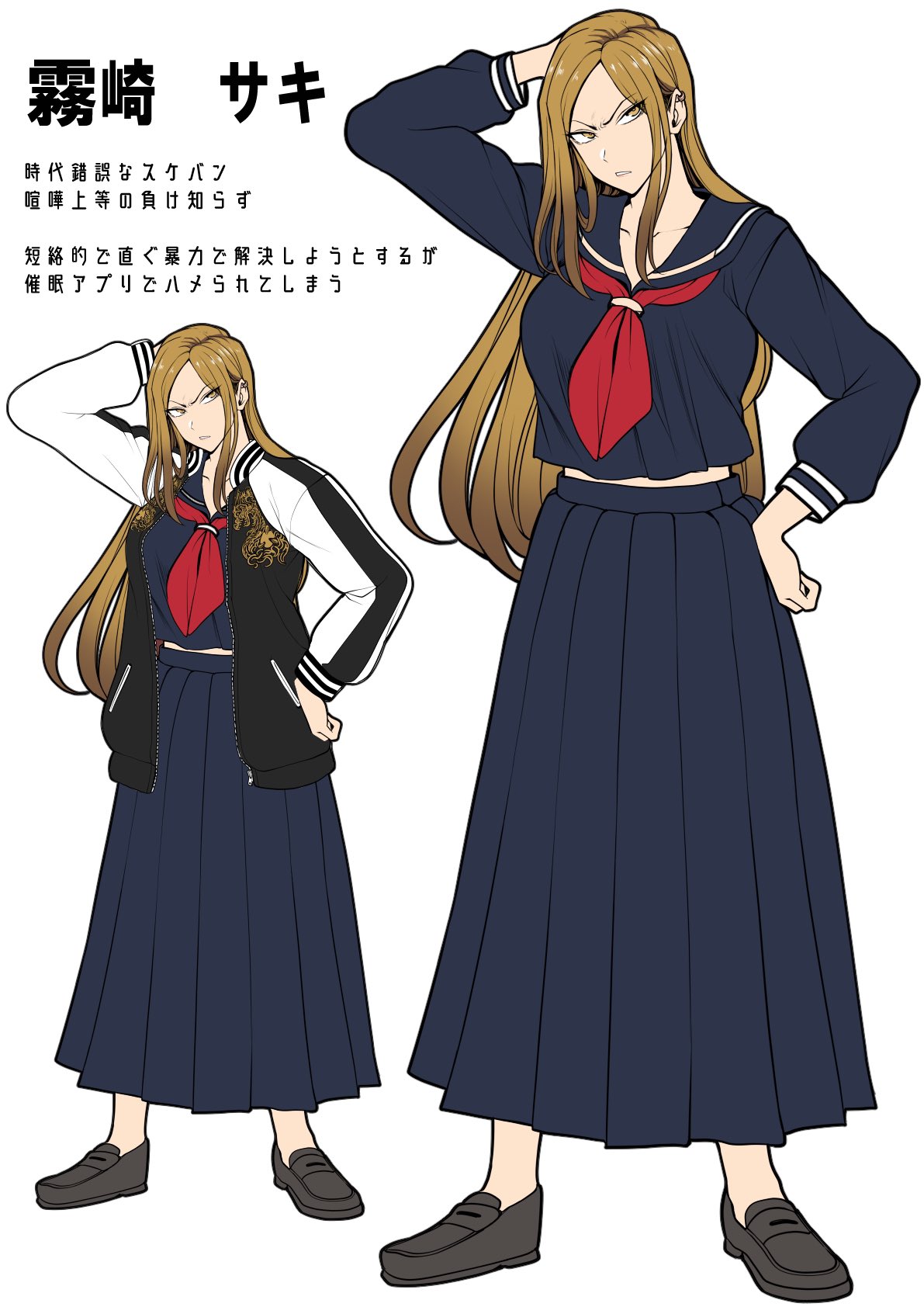 1girl aiue_oka blonde_hair blue_dress breasts character_request colorized delinquent dress earrings full_body hand_on_own_head highres jacket jewelry large_breasts looking_to_the_side necktie open_clothes open_jacket open_mouth original red_necktie sailor_collar school_uniform simple_background straight_hair sukajan sukeban tagme white_background