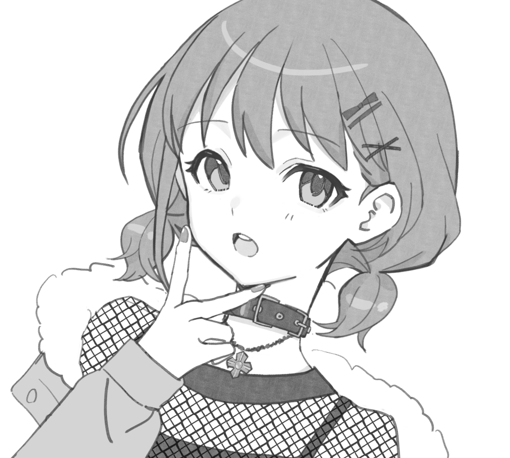 1girl collar fishnet_top fishnets girls_band_cry hair_ornament hairclip hand_up iseri_nina kuji_(orca9ji) long_sleeves low_twintails open_mouth short_hair short_twintails simple_background solo teeth twintails upper_teeth_only v white_background