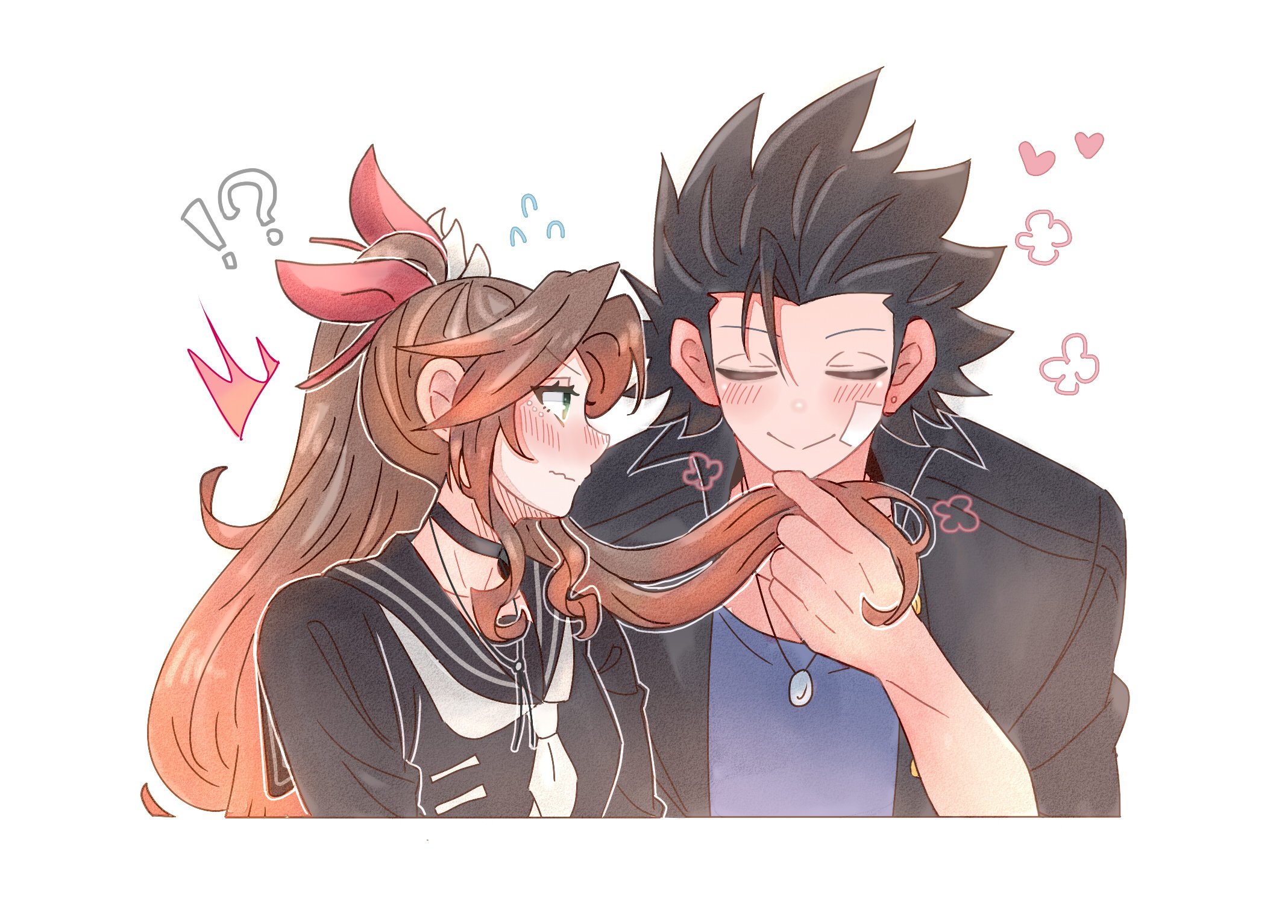 !? 1boy 1girl 7_(milu577610) aerith_gainsborough aerith_gainsborough_(midgard_seventh_high_school) bandaid bandaid_on_cheek bandaid_on_face black_choker black_hair black_jacket black_sailor_collar black_serafuku blue_shirt blush brown_hair choker closed_eyes closed_mouth commentary couple delinquent final_fantasy final_fantasy_vii final_fantasy_vii:_ever_crisis flying_sweatdrops gakuran green_eyes hair_ribbon heart highres holding_another's_hair jacket jewelry long_hair looking_at_another necklace official_alternate_costume open_clothes open_jacket parted_lips pink_ribbon ribbon sailor_collar school_uniform serafuku shirt simple_background smile spiked_hair sukeban untranslatable_commentary white_serafuku zack_fair zack_fair_(midgard_seventh_high_school)