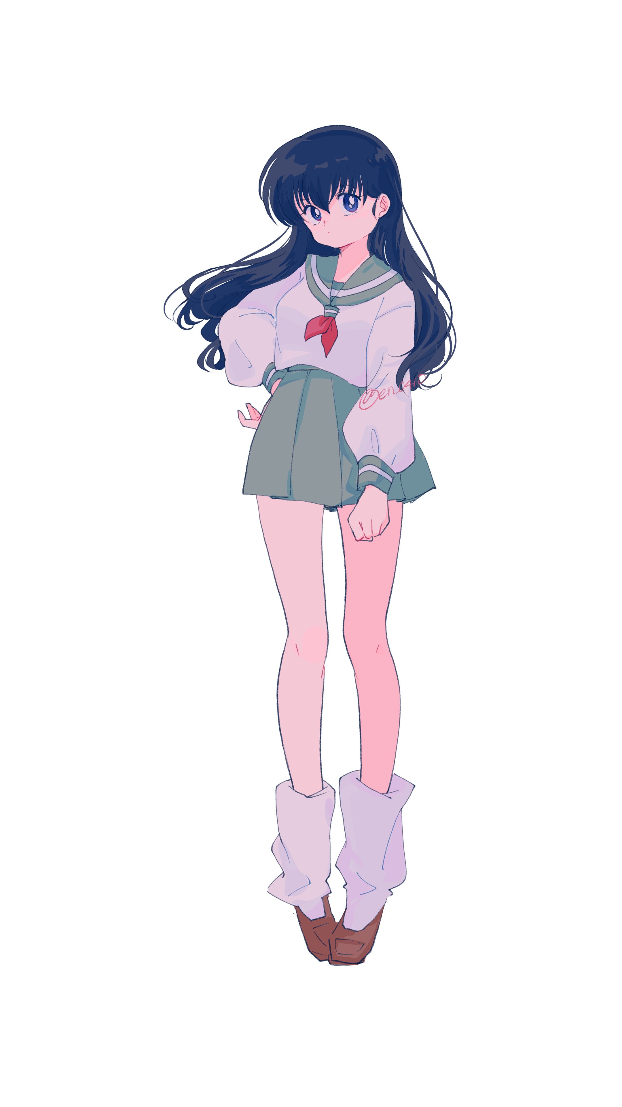 1girl absurdres black_hair brown_shoes closed_mouth commentary en_0410 eyelashes full_body green_sailor_collar green_skirt hand_on_own_hip highres higurashi_kagome inuyasha leg_warmers long_hair sailor_collar sailor_shirt shirt shoes simple_background skirt solo standing untranslatable_commentary wavy_hair white_background white_shirt