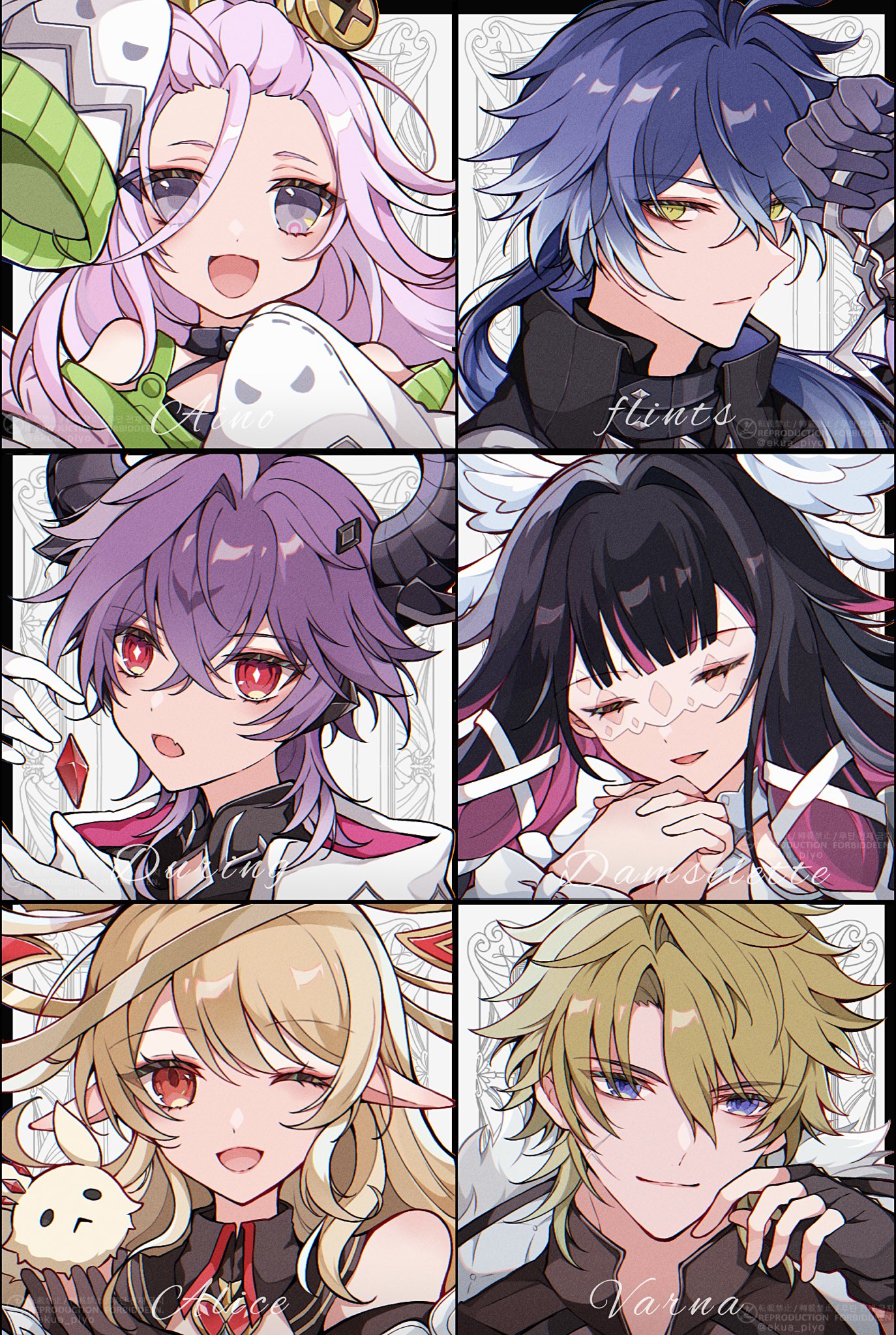 3boys 3girls aino_(genshin_impact) alice_(genshin_impact) black_gloves black_hair blonde_hair blue_eyes blue_hair character_name closed_eyes columbina_(genshin_impact) dodoco_(genshin_impact) ekua_piyo fingerless_gloves flins_(genshin_impact) genshin_impact gloves head_wings highres horns long_hair mini_durin_(genshin_impact) durin_(genshin_impact) multicolored_hair multiple_boys multiple_girls open_mouth orange_eyes pink_eyes pink_hair pointy_ears portrait purple_eyes purple_hair short_hair two-tone_hair varka_(genshin_impact) wings yellow_eyes