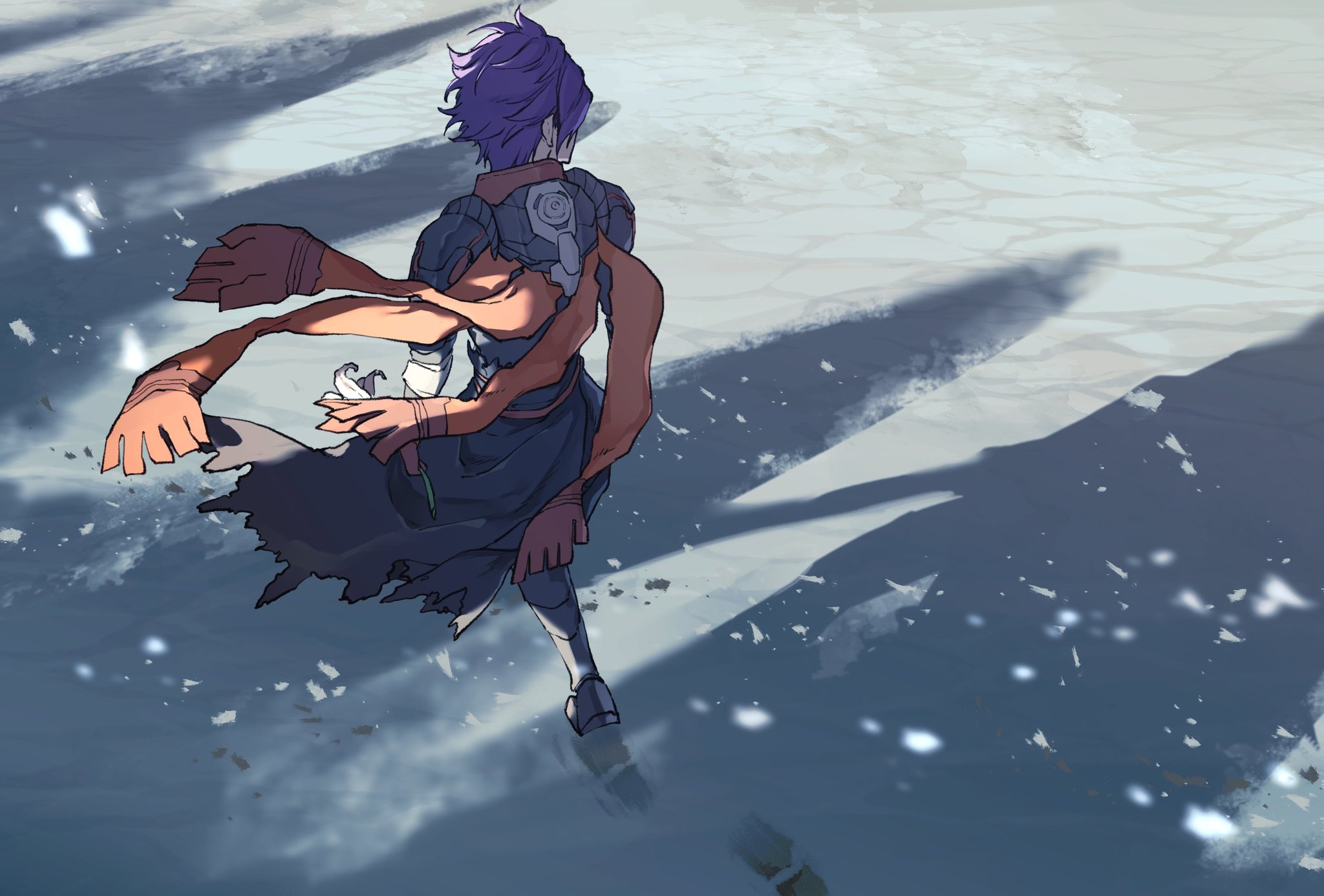 1boy armor fire fire_emblem fire_emblem:_three_houses fire_emblem_warriors:_three_hopes from_behind highres male_shez_(fire_emblem) messy_hair nintendo purple_hair saneyoshiii7 snow snowflakes snowing walking