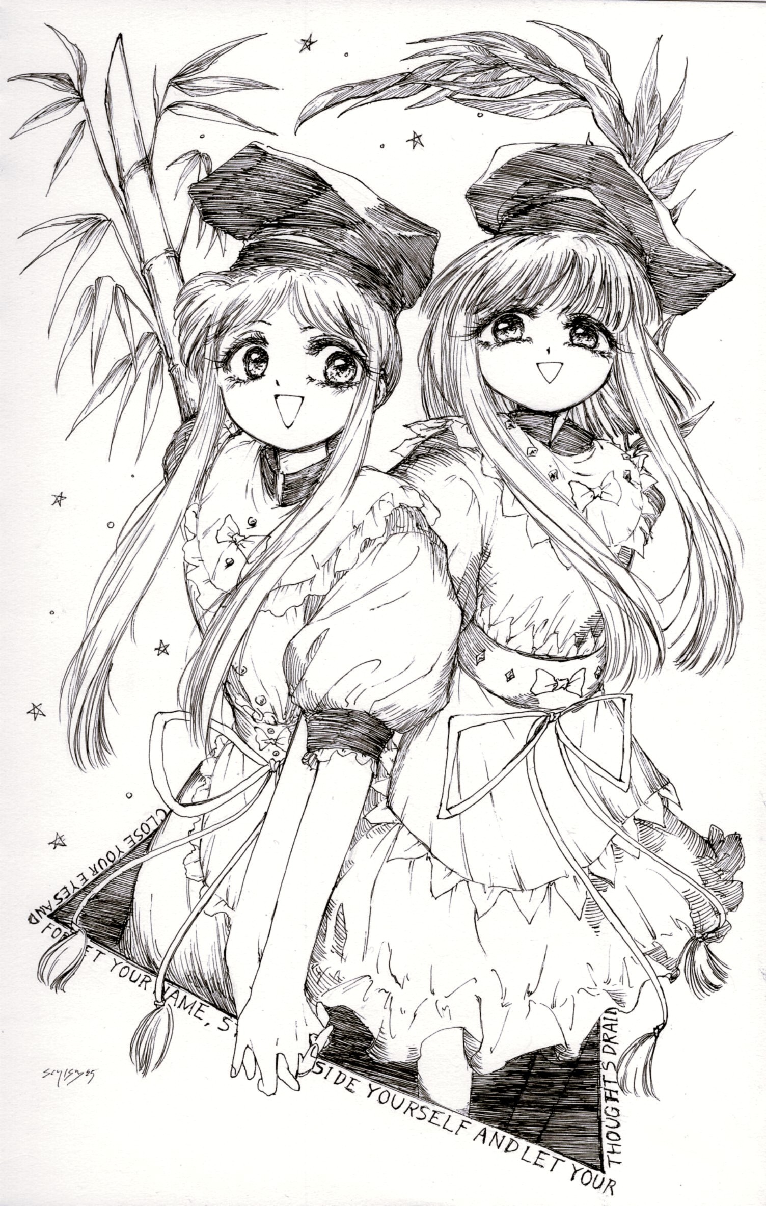 2girls :d bamboo commentary_request dress english_text greyscale highres holding_hands looking_at_viewer monochrome multiple_girls myouga_(plant) nishida_satono open_mouth schizos_dq short_hair_with_long_locks short_sleeves signature smile teireida_mai thea_(fire_emblem) touhou traditional_media