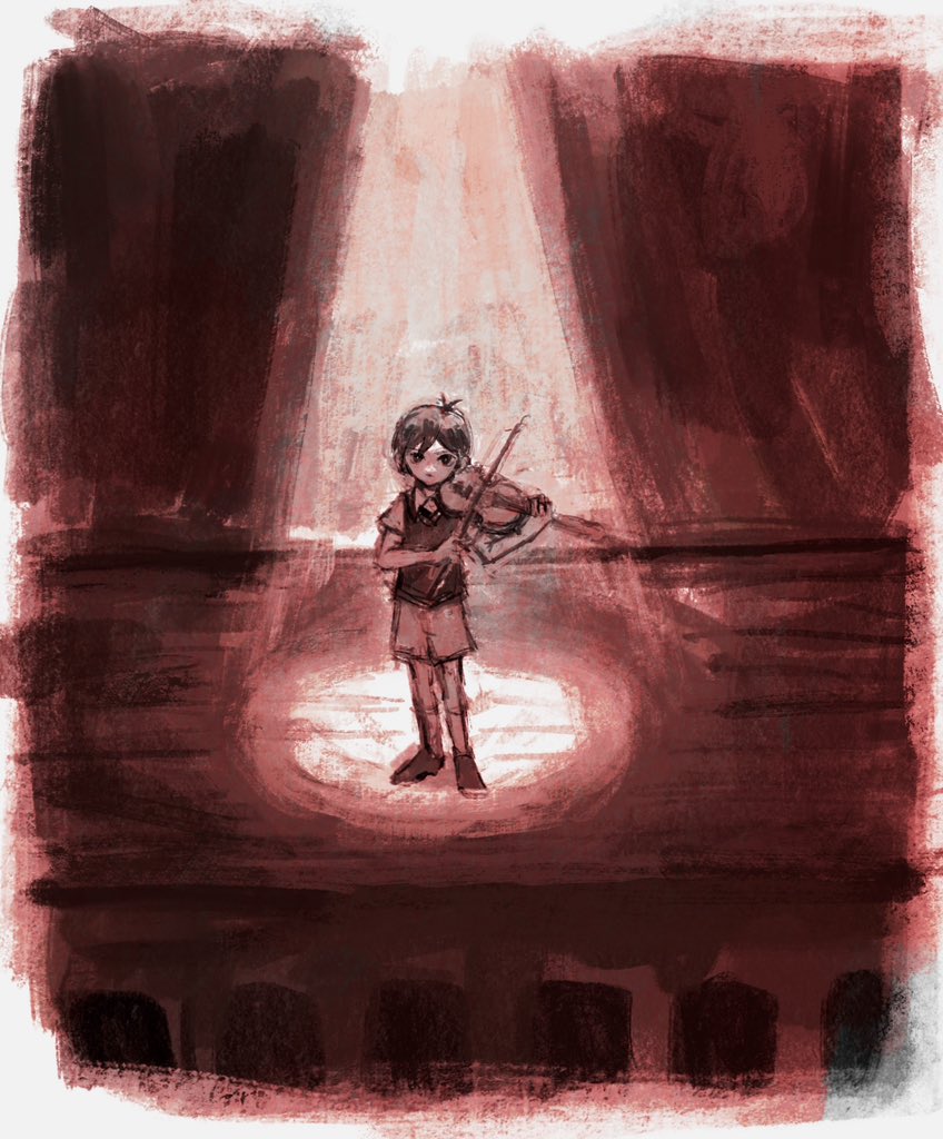 1boy antenna_hair black_eyes black_hair black_shoes bow_(music) brown_shorts chan_(semi_mi) closed_mouth collared_shirt holding holding_bow_(music) holding_instrument holding_violin instrument male_focus music omori playing_instrument red_theme shirt shoes short_hair short_sleeves shorts socks spotlight standing sunny_(omori) violin white_shirt white_socks