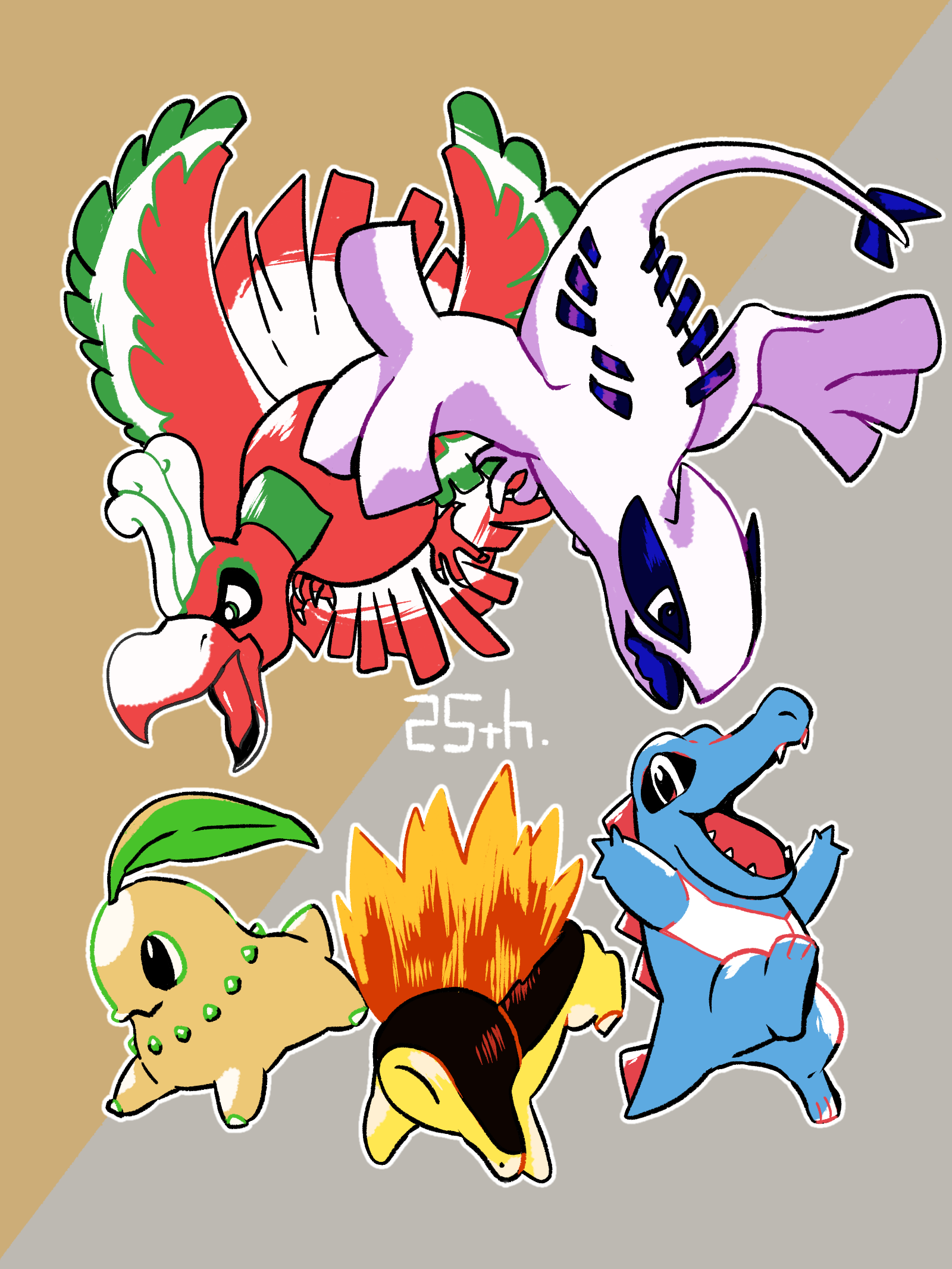 anniversary arms_up black_eyes chikorita cyndaquil full_body gen_2_pokemon grey_background highres ho-oh legendary_pokemon limited_palette lugia mizuto_(o96ap) nintendo no_humans nostrils open_mouth pokemon pokemon_(creature) pokemon_gold/silver/crystal starter_pokemon_trio totodile two-tone_background yellow_background