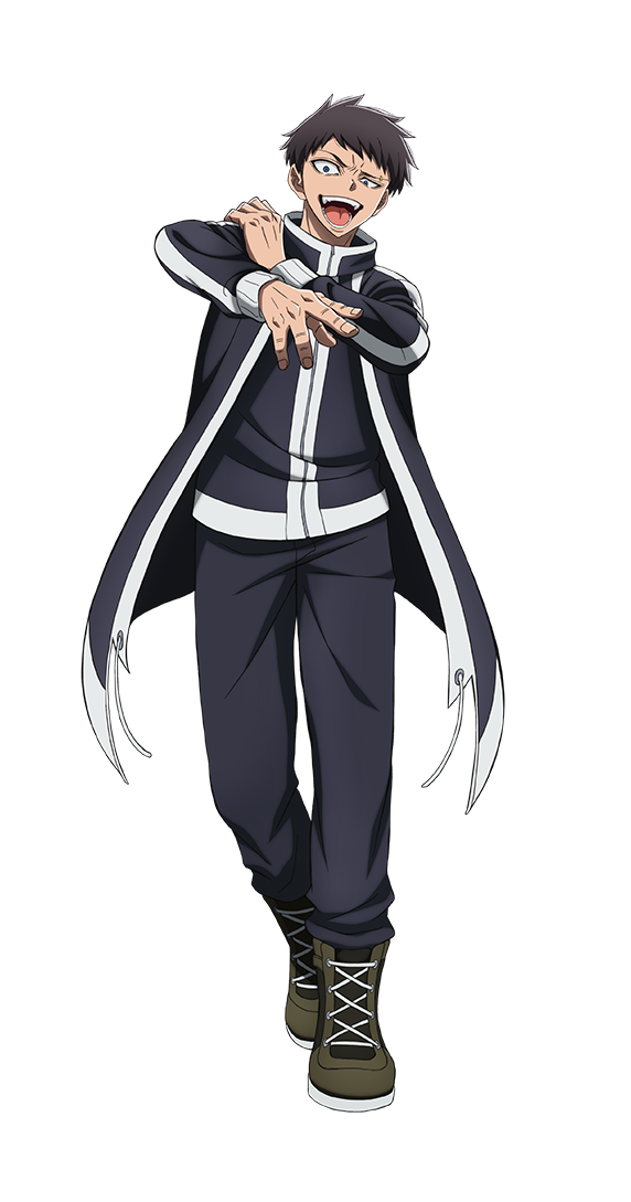 1boy amisaki_ryouko anime_coloring black_hair blue_eyes boots full_body green_boots grey_jacket grey_pants hand_on_own_shoulder jacket long_sleeves looking_at_viewer official_art open_hand open_mouth pants short_hair simple_background smile solo standing teeth tongue tougen_anki track_jacket transparent_background very_short_hair yaoroshi_ikari