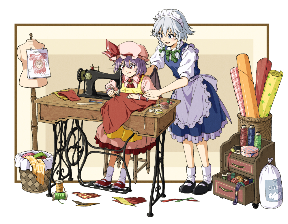 2girls :d :q apron ascot basket bat_wings black_shoes blue_eyes blue_skirt blue_vest bow chair collared_shirt commentary_request fabric frilled_shirt_collar frilled_skirt frills green_bow grey_hair hair_bow hat inuno_rakugaki izayoi_sakuya maid maid_headdress mannequin medium_hair mob_cap multiple_girls needle open_mouth pencil pink_hat pink_shirt puffy_short_sleeves puffy_sleeves purple_hair red_ascot red_eyes red_shoes red_skirt remilia_scarlet ruler sewing sewing_machine sewing_needle shirt shoes short_hair short_sleeves skirt smile socks spool stuffing tongue tongue_out touhou vest waist_apron white_apron white_socks wings wrist_cuffs yarn yellow_apron
