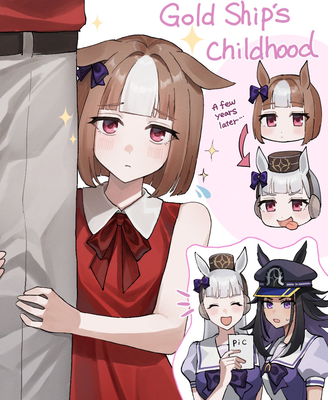 2girls age_progression aged_down alternate_hair_color animal_ears brown_hair fenomeno_(umamusume) flying_sweatdrops gold_ship_(umamusume) grey_hair grey_pants hair_ribbon hat highres himo_(user_rzgz5877) horse_ears horse_girl multiple_girls pants peaked_cap photo_(object) pink_eyes purple_eyes ribbon school_uniform tongue tongue_out tracen_school_uniform umamusume
