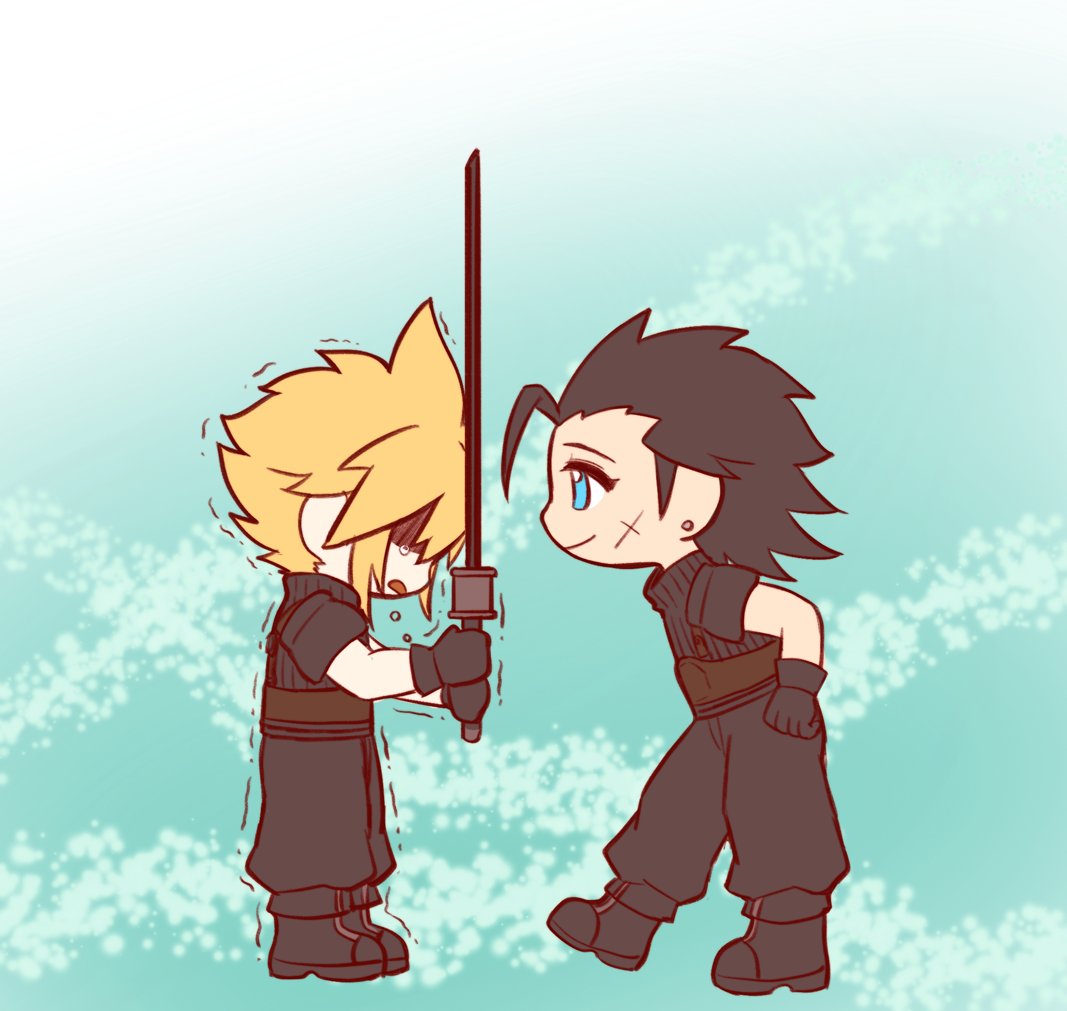 2boys aqua_eyes armor baggy_pants belt black_boots black_hair black_pants blonde_hair boots brown_belt buster_sword chibi chibi_only closed_mouth cloud_strife cross_scar crying earrings facial_scar final_fantasy final_fantasy_vii full_body hair_over_eyes hair_slicked_back hand_on_own_hip holding holding_sword holding_weapon jewelry lll777777lll looking_at_another male_focus medium_hair multiple_boys pants parted_lips partially_shaded_face pauldrons scar scar_on_cheek scar_on_face short_hair shoulder_armor single_earring sleeveless sleeveless_turtleneck smile spiked_hair suspenders sword tears trembling turtleneck weapon zack_fair
