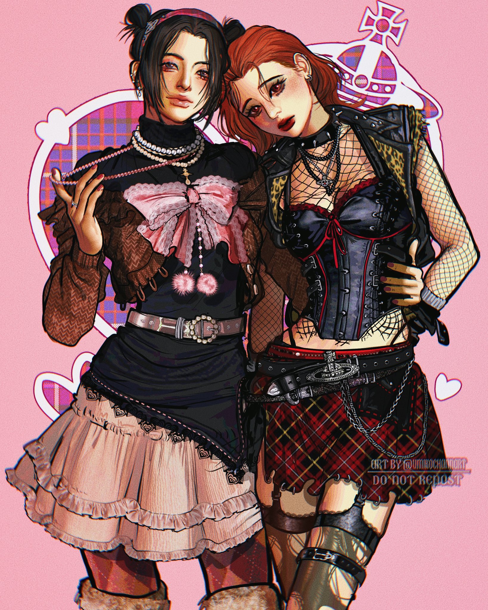 2girls belt black_corset black_hair black_shirt brown_eyes brown_hair commentary_request copyright_request corset highres jewelry kneehighs komatsu_nana long_skirt miniskirt multiple_girls nail_polish nana_(series) necklace osaki_nana pearl_necklace pink_belt red_lips red_nails shirt skirt socks umikochannart yuri