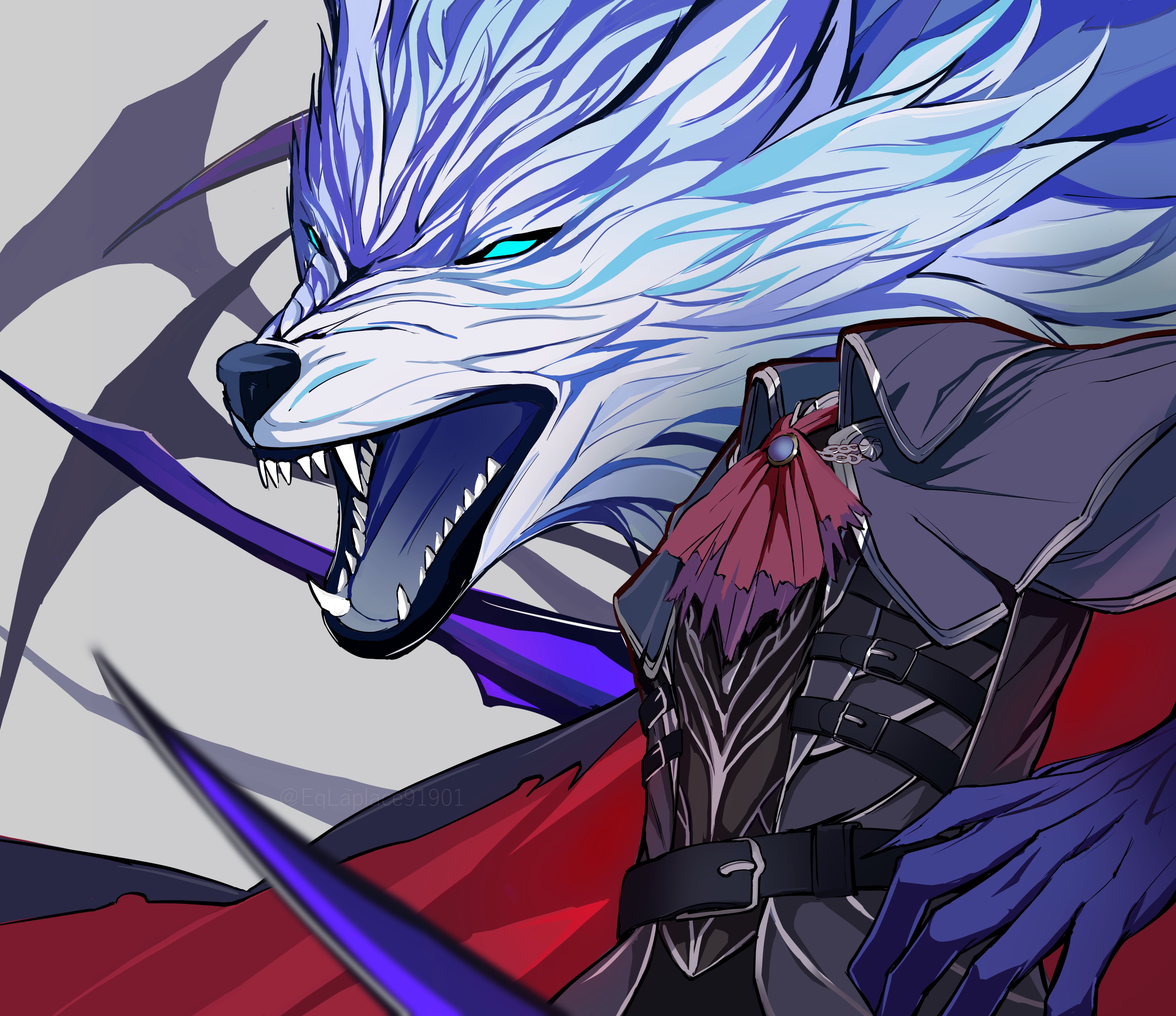 2boys absurdres animal belt black_shirt blue_eyes cape fate/grand_order fate_(series) headless hessian_(fate) highres lobo_(fate) multiple_belts multiple_boys open_mouth red_cape sharp_teeth shirt teeth twitter_username uriuriyukitti white_hair wolf
