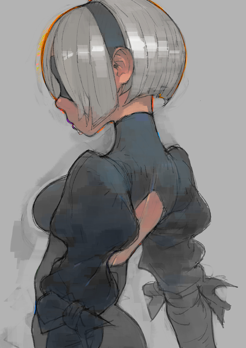 1girl 2b_(nier:automata) back_cutout black_dress black_hairband blindfold breasts clothing_cutout covered_eyes dress drooling grey_background grey_hair hairband highres juliet_sleeves long_sleeves medium_breasts mouth_drool nier:automata nier_(series) profile puffy_sleeves short_hair sketch solo turtleneck turtleneck_dress umezawa_michiko upper_body
