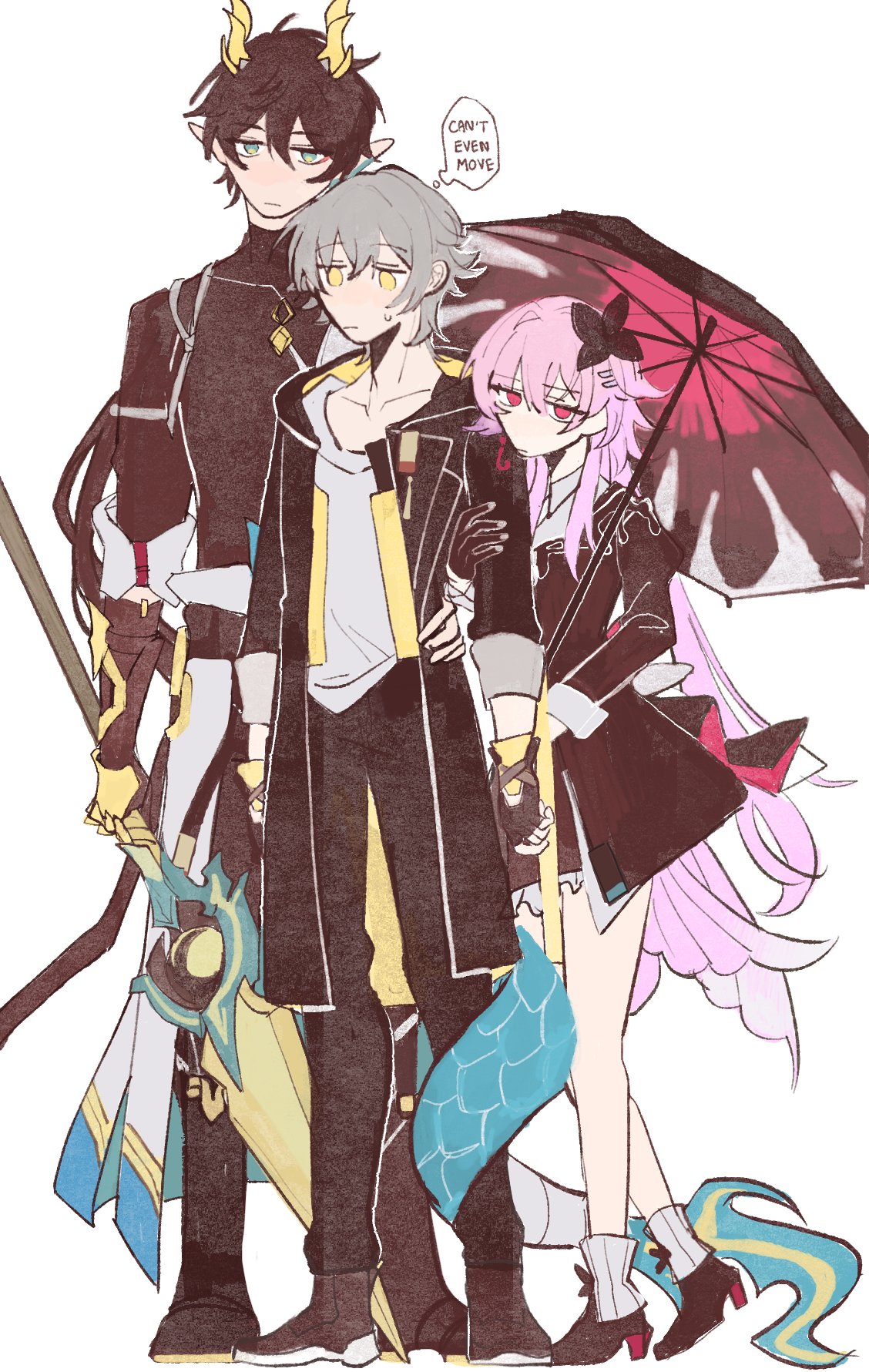 1girl 2boys black_boots black_coat black_dress black_flower black_gloves black_hair black_pants black_shirt black_shoes boots caelus_(honkai:_star_rail) chinese_clothes closed_mouth coat collarbone collared_dress dan_heng_(honkai:_star_rail) dan_heng_(permansor_terrae)_(honkai:_star_rail) dragon_boy dragon_horns dragon_tail dress earclip empty_eyes english_text evernight_(honkai:_star_rail) eyeliner fingerless_gloves flower frills from_side full_body gauntlets gem gloves green_eyes grey_hair hair_between_eyes hair_flower hair_ornament hairclip half-closed_eyes hand_around_waist high_heels highres holding holding_polearm holding_umbrella holding_weapon honkai:_star_rail honkai_(series) hood hooded_coat horns long_sleeves looking_at_another looking_down low_ponytail low_twintails makeup march_7th_(honkai:_star_rail) mariroynum1 multiple_boys official_alternate_costume official_alternate_hairstyle open_clothes open_coat pants pink_hair pointy_ears polearm ponytail red_eyeliner red_eyes shirt shoes short_hair sidelocks simple_background socks spear speech_bubble standing sweatdrop t-shirt tail thought_bubble trailblazer_(honkai:_star_rail) twintails two-sided_coat two-sided_fabric two-tone_dress umbrella weapon white_background white_coat white_dress white_shirt white_socks yellow_coat yellow_eyes yellow_gem