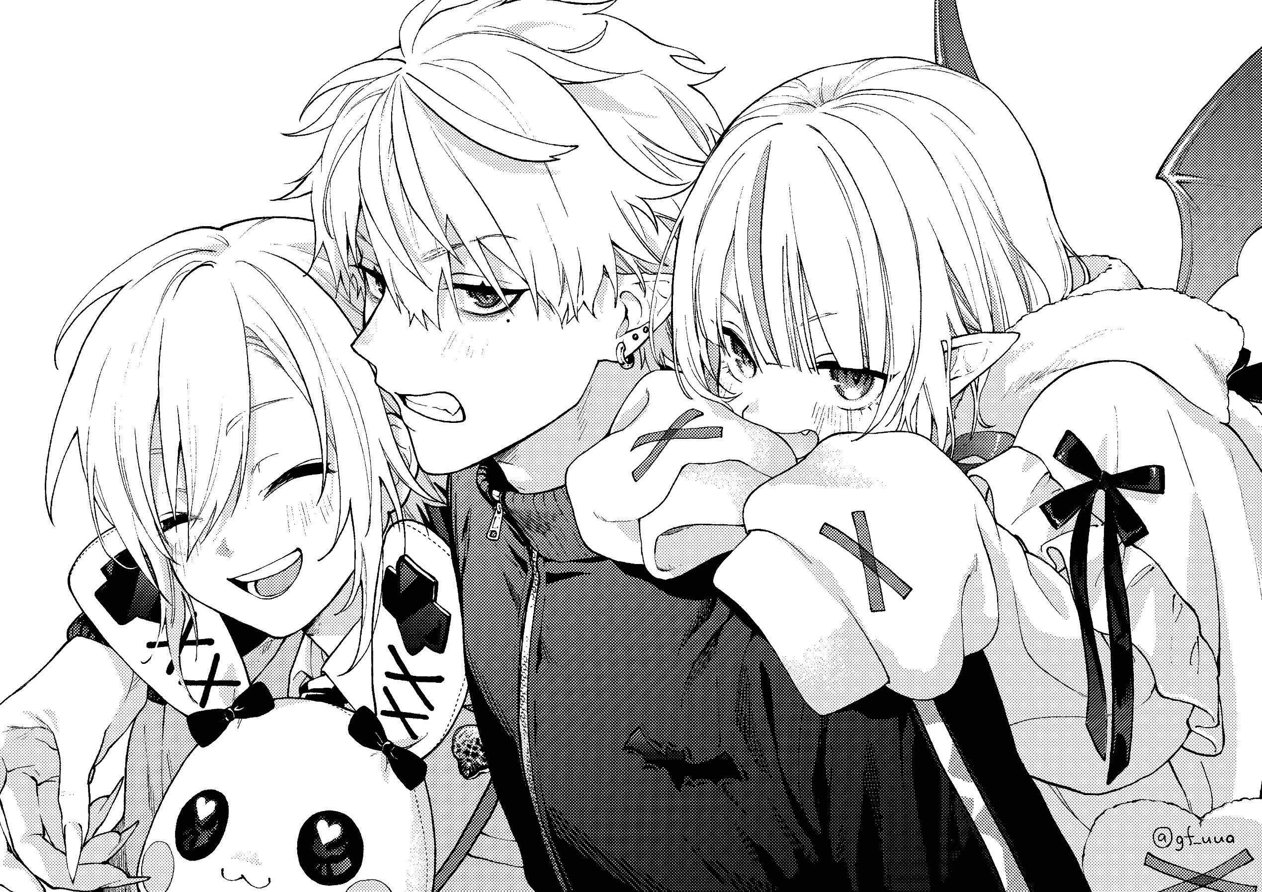 1girl 2boys arm_on_another's_shoulder closed_eyes demon_wings fang gf_uua greyscale hair_between_eyes highres holding holding_stuffed_toy jacket kuzuha_(nijisanji) looking_at_viewer loser_kings makaino_ririmu monochrome multiple_boys nijisanji open_mouth pointy_ears short_hair simple_background sleeves_past_fingers sleeves_past_wrists smile stuffed_animal stuffed_rabbit stuffed_toy teeth track_jacket upper_body uzuki_kou virtual_youtuber white_background wings