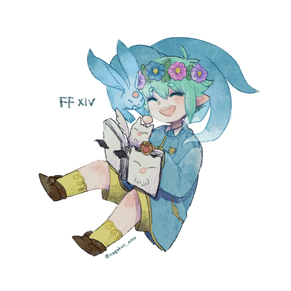 1boy alternate_costume antenna_hair basil_(headspace)_(omori) basil_(omori) blush boots brown_boots character_request chibi chibi_only colored_skin final_fantasy final_fantasy_xiv flower full_body green_hair head_wreath male_focus nagakun_omo omori open_mouth pointy_ears short_hair smile socks solo teeth upper_teeth_only white_skin yellow_socks