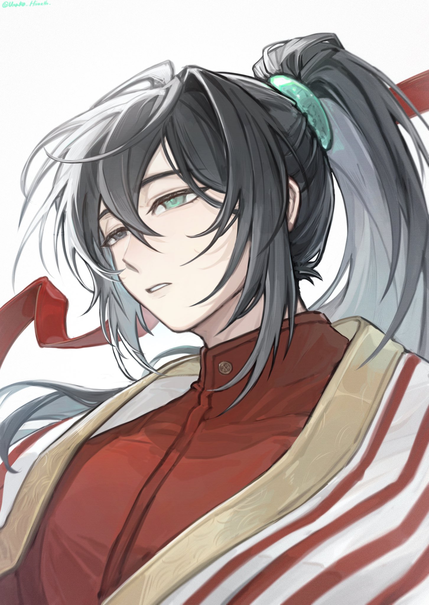 1boy black_eyes black_hair blue_eyes chinese_clothes coat heterochromia high_ponytail highres hong_lu_(project_moon) land_of_illusion_(e.g.o) limbus_company long_hair looking_at_viewer male_focus ponytail project_moon red_shirt shirt simple_background solo striped_coat unako_hiraeth upper_body very_long_hair white_background white_coat