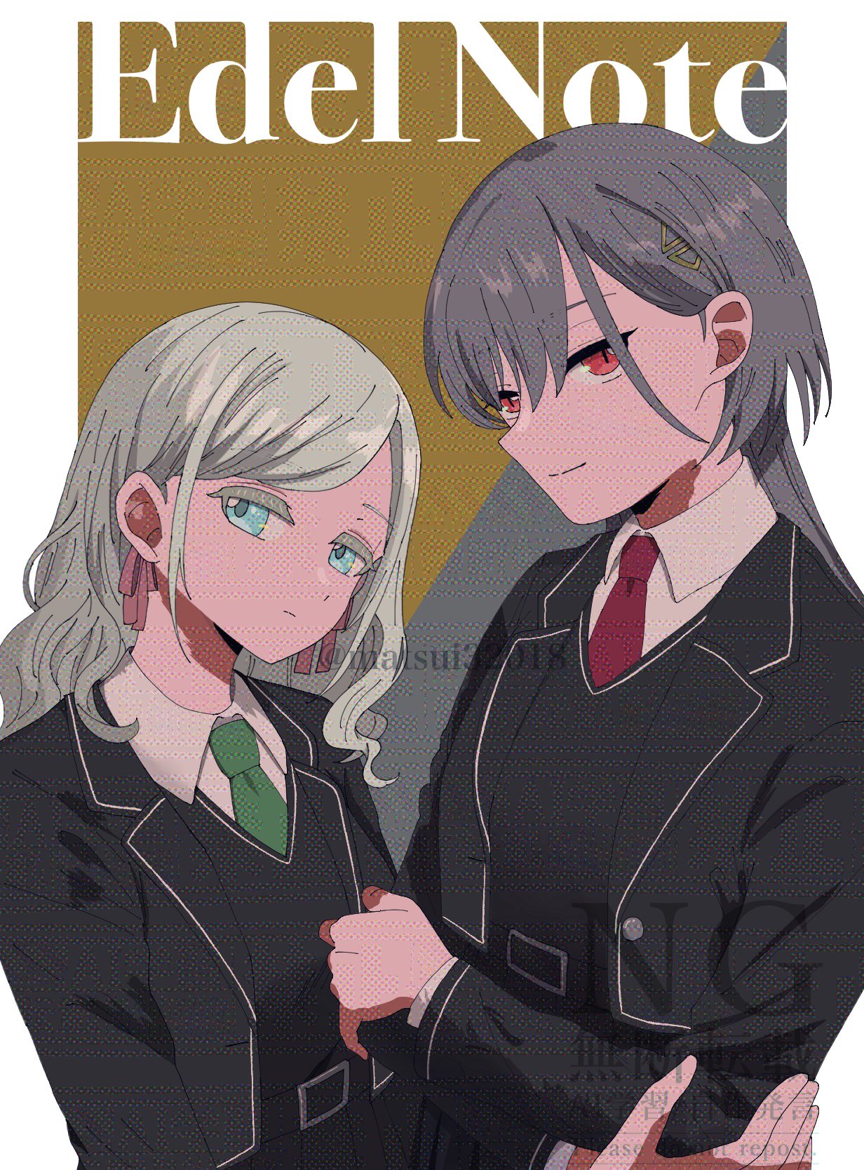 2girls black_jacket black_skirt black_sweater_vest blazer blue_eyes brown_background ceras_yanagida_lilienfeld collared_shirt colored_eyelashes dress_shirt edel_note expressionless green_necktie grey_hair group_name hair_ornament hair_ribbon highres jacket katsuragi_izumi light_frown link!_like!_love_live! long_hair looking_at_viewer love_live! matsui_ibuki mizukawa_school_uniform multiple_girls necktie open_clothes open_jacket orange_eyes pink_ribbon pleated_skirt red_necktie ribbon school_uniform shirt skirt slit_pupils smile sweater_vest triangle_hair_ornament twitter_username upper_body virtual_youtuber watermark watermark_grid wavy_hair white_shirt wolf_cut