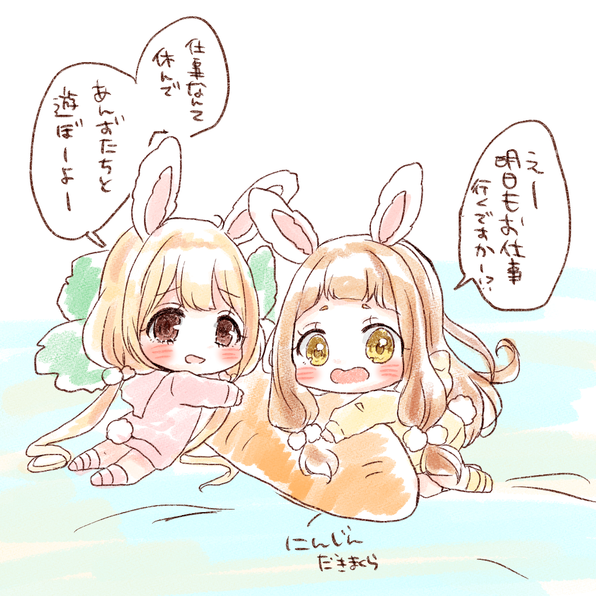 2girls :d animal_ears blonde_hair blush brown_eyes brown_hair chibi commentary_request futaba_anzu highres hood hood_down hoodie ichihara_nina idolmaster idolmaster_cinderella_girls idolmaster_cinderella_girls_starlight_stage kemonomimi_mode long_sleeves low_twintails mini_person minigirl multiple_girls open_mouth pink_hoodie pink_socks puffy_long_sleeves puffy_sleeves rabbit_ears rino_cnc sleeves_past_wrists smile socks striped_clothes striped_socks translation_request twintails white_background yellow_hoodie yellow_socks