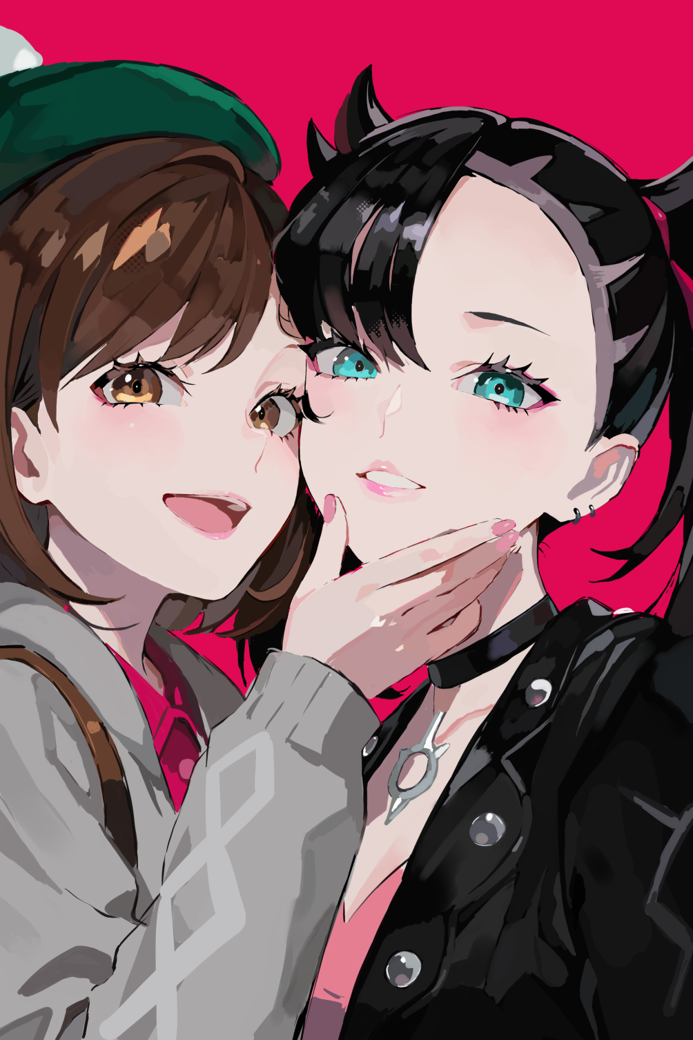2girls :d ai-assisted aqua_eyes asymmetrical_bangs black_choker black_hair black_jacket brown_eyes brown_hair cardigan choker dress earrings gloria_(pokemon) green_hat grey_cardigan grin hat highres jacket jewelry looking_at_viewer marnie_(pokemon) multiple_girls nintendo open_mouth pink_dress pokemon pokemon_sword_and_shield red_background simple_background smile tam_o'_shanter tor_(torkrub111) twintails upper_body