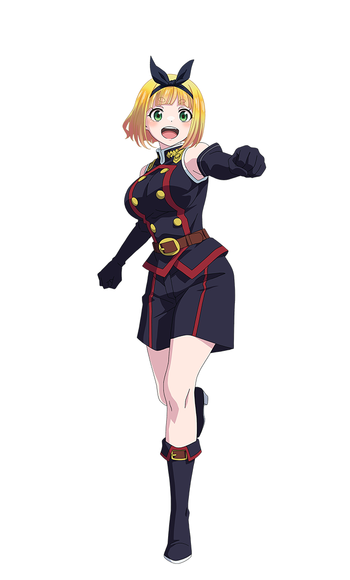 1girl anime_coloring anti-demon_corps_uniform belt black_boots black_gloves black_hairband black_jacket black_shorts blonde_hair boots bow_hairband breasts brown_belt clenched_hands elbow_gloves full_body gloves green_eyes hairband huge_breasts jacket large_breasts looking_at_viewer mato_seihei_no_slave nakano_keiya official_art open_mouth outstretched_arm reaching reaching_towards_viewer short_hair shorts simple_background sleeveless sleeveless_jacket smile solo standing suruga_shushu teeth transparent_background