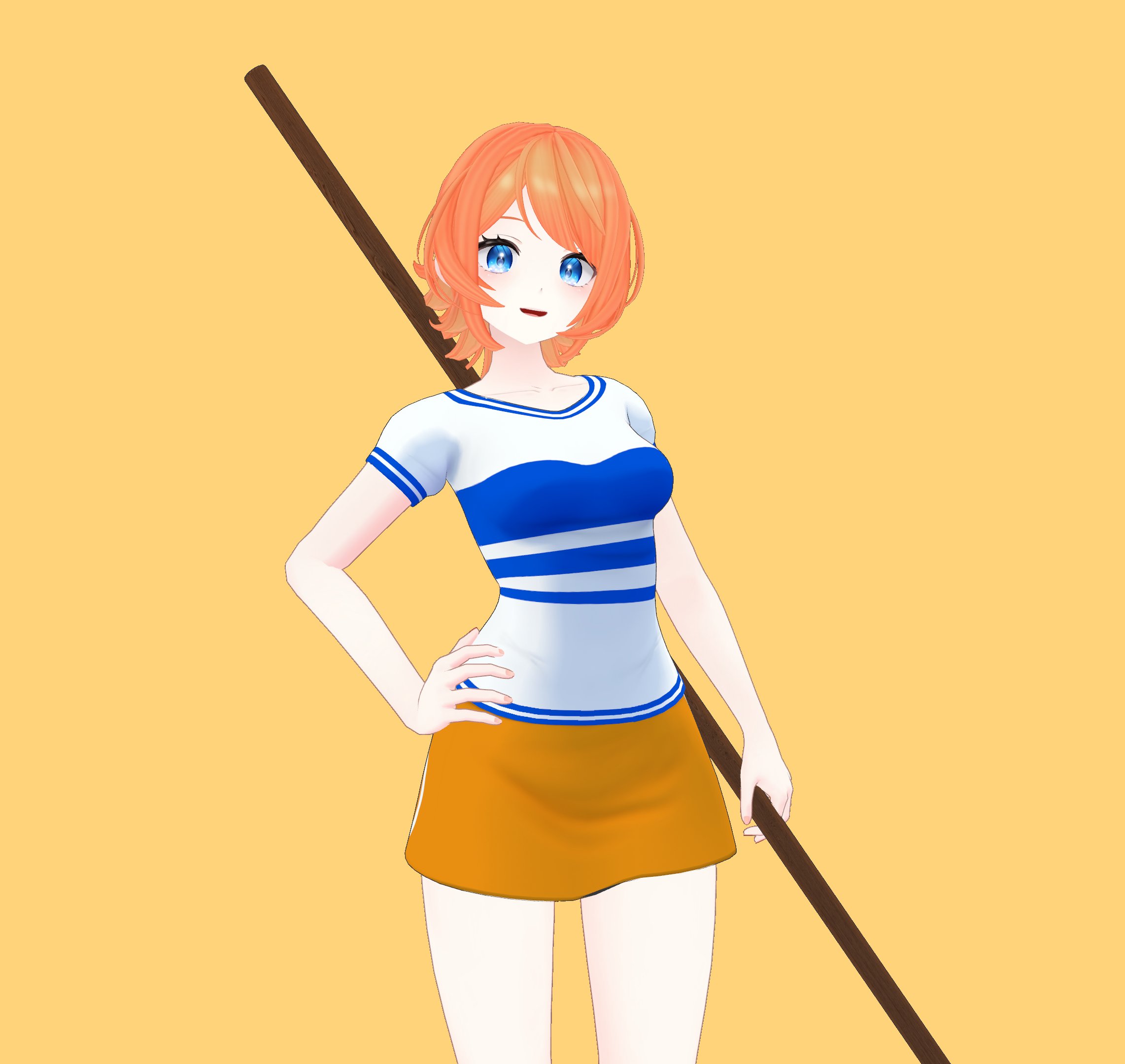 1girl 2024 blue_eyes breasts cosplay hair_between_eyes hand_on_own_hip highres holding holding_staff ker2348 large_breasts miniskirt nami_(one_piece) nami_(one_piece)_(cosplay) nami_(one_piece)_(return_to_sabaody) narrow_waist one_piece open_mouth orange_background orange_hair orange_skirt secretto_(waktaverse) shirt simple_background skirt smile solo staff staff_(weapon) striped_clothes striped_shirt virtual_youtuber waktaverse wide_hips yellow_background yellow_skirt