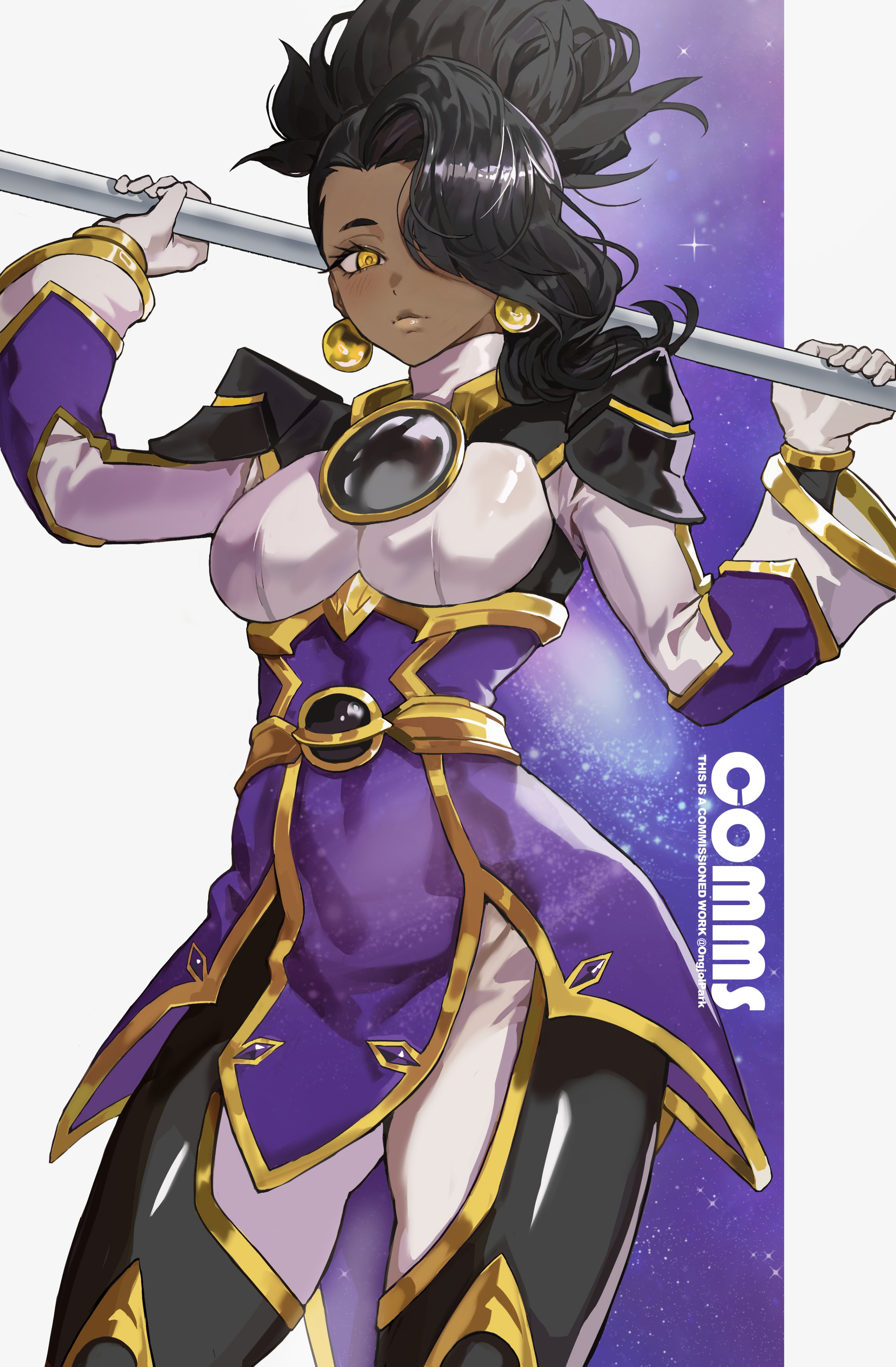 1girl absurdres belt black_gem black_hair black_pants blush borrowed_character breasts brooch closed_mouth commentary commission cowboy_shot curtained_hair dark-skinned_female dark_skin earrings english_commentary gem gloves gold_belt gold_earrings gold_trim hair_over_one_eye hands_up highres holding holding_staff jewelry kamen_rider laura_burrell_(k.r._starman) long_sleeves looking_at_viewer medium_breasts original pants park_ongjol purple_skirt shoulder_pads skirt solo staff star_(sky) starry_sky_background turtleneck white_gloves yellow_eyes