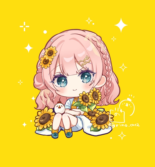 1girl animal bird blue_shoes blush braid chibi chicken closed_mouth commentary_request flower full_body hair_bun hair_flower hair_ornament hairclip hugging_object knees_up looking_at_viewer original pink_hair ribbed_socks rino_cnc shirt shoes short_sleeves simple_background single_side_bun sitting skirt smile socks solo sparkle sunflower twitter_username white_shirt white_skirt yellow_background yellow_flower yellow_socks