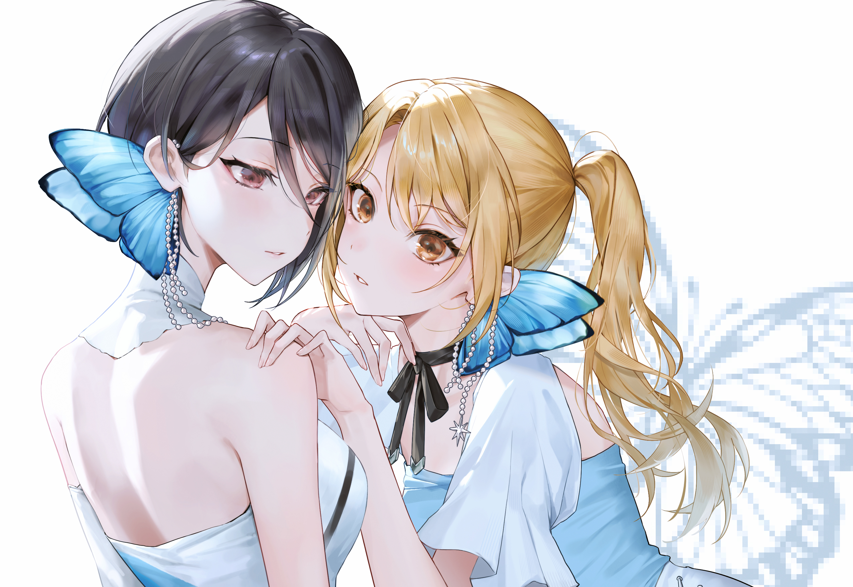 2girls bang_dream! bang_dream!_girls_band_party! black_choker black_hair blonde_hair brown_eyes butterfly_hair_ornament choker commentary hair_between_eyes hair_ornament hashtag-only_commentary highres kirigaya_toko kiska_(mnvy2332) magnet_(vocaloid) multiple_girls parted_bangs parted_lips ponytail red_eyes ribbon_choker simple_background upper_body white_background yashio_rui