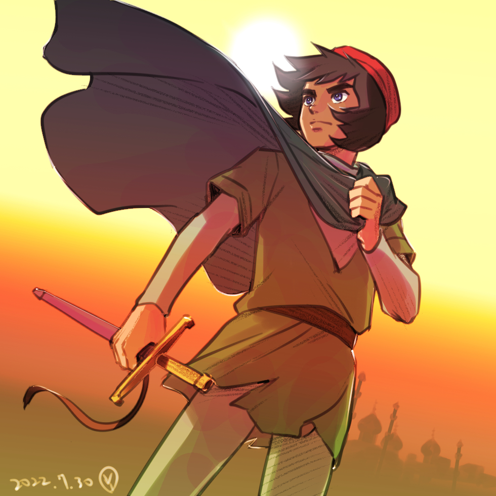 1boy animation_kikou:_marco_polo_no_bouken belt black_hair blue_cape blue_eyes brown_belt brown_tunic cape closed_mouth commentary dated dutch_angle floating_cape from_below hat holding holding_sheath holding_sword holding_weapon layered_sleeves long_sleeves male_focus marco_polo_(marco_polo_no_bouken) middle_eastern_architecture minaret outdoors pants red_hat sakai_yume sheath sheathed short_hair short_over_long_sleeves short_sleeves signature sky skyline solo sun sword tunic weapon white_pants white_sleeves yellow_sky