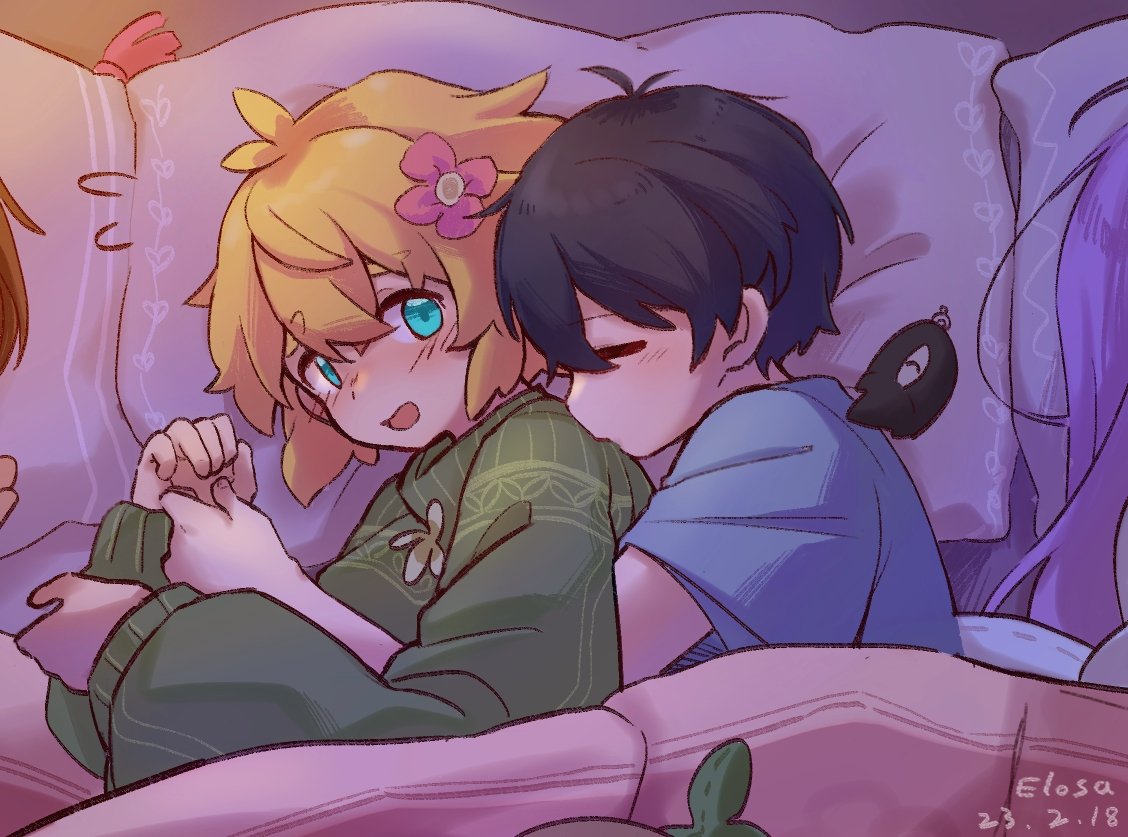 1girl 3boys antenna_hair artist_name aubrey_(faraway)_(omori) aubrey_(omori) basil_(faraway)_(omori) basil_(omori) black_hair blonde_hair blue_eyes blue_shirt blush character_charm charm_(object) closed_eyes closed_mouth dated elosa flower flying_sweatdrops green_sweater hair_flower hair_ornament head_on_pillow hug hug_from_behind kel_(faraway)_(omori) kel_(omori) long_hair long_sleeves looking_at_another male_focus multiple_boys omori open_mouth pillow pink_hair shirt short_hair short_sleeves something_(omori) sunny_(omori) sweater t-shirt under_covers yaoi