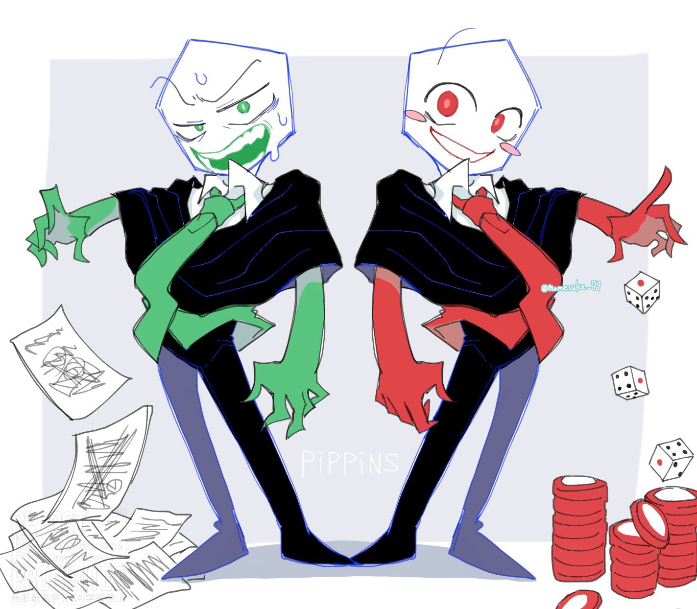 2boys black_pants blush_stickers commentary deltarune dice gloves green_eyes green_gloves green_necktie green_pippins highres mamesuke_77 multiple_boys necktie object_head open_mouth pants paper pippins_(deltarune) poker_chip red_eyes red_gloves red_necktie shirt smile untranslatable_commentary utdr_(toby_fox)