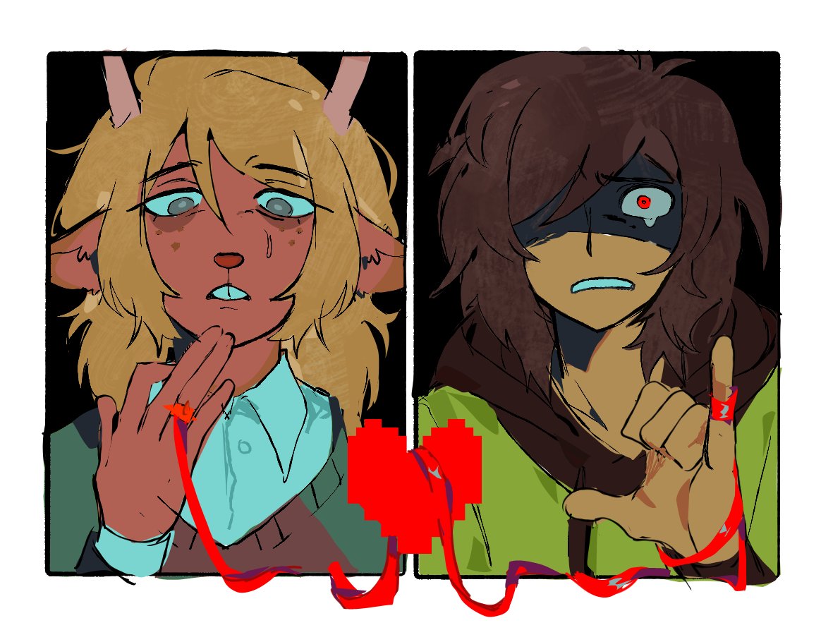 1girl 1other alternate_skin_color animal_ears audieaudieaudie black_hoodie blonde_hair brown_hair collared_shirt commentary deer_ears deer_girl deltarune english_commentary furry furry_female grey_eyes heart hood hoodie jewelry kris_(deltarune) noelle_holiday partially_shaded_face pixel_heart red_eyes ring shirt short_hair soul_(deltarune) string string_of_fate sweater tears thorn_ring_(deltarune) utdr_(toby_fox) weird_route_(deltarune) white_shirt