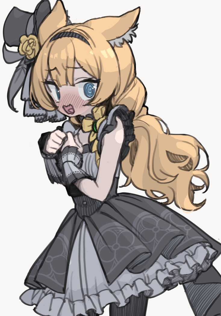 1girl @_@ animal_ear_fluff animal_ears black_dress black_hairband black_hat black_pantyhose blue_archive blush commentary dress flower grey_dress hair_between_eyes hairband hat hat_feather hat_flower long_hair looking_at_viewer mari_(blue_archive) mari_(idol)_(blue_archive) mini_hat mini_top_hat monaka_ooji nose_blush open_mouth orange_hair pantyhose simple_background solo top_hat
