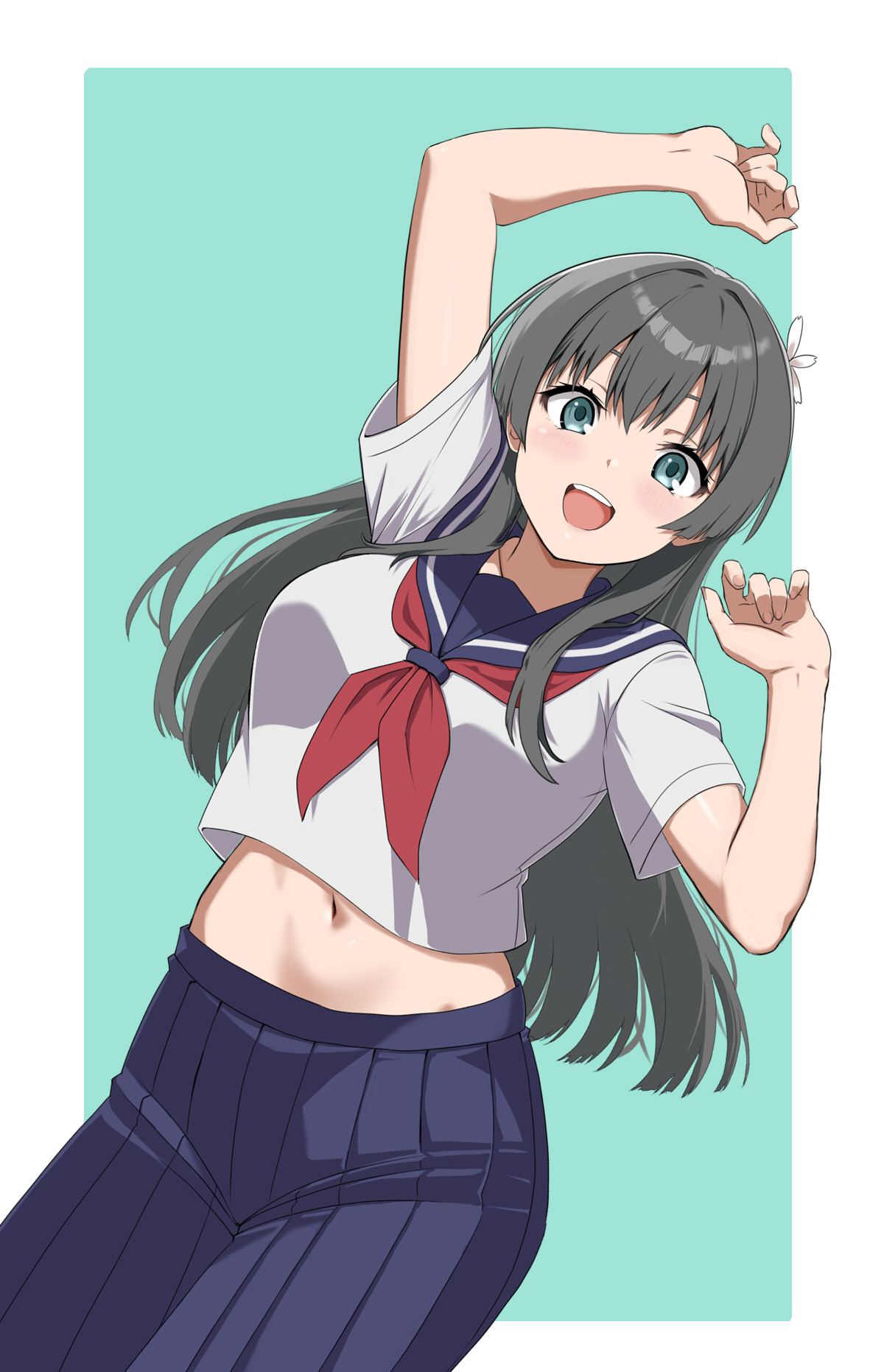 :d arms_up black_hair black_skirt blue_sailor_collar breasts commentary_request flower hair_flower hair_ornament highres infinite_moppy long_hair medium_breasts midriff navel neckerchief open_mouth pleated_skirt red_neckerchief sailor_collar sakugawa_school_uniform saten_ruiko school_uniform serafuku shirt simple_background skirt smile summer_uniform teeth toaru_kagaku_no_railgun toaru_majutsu_no_index upper_teeth_only white_shirt