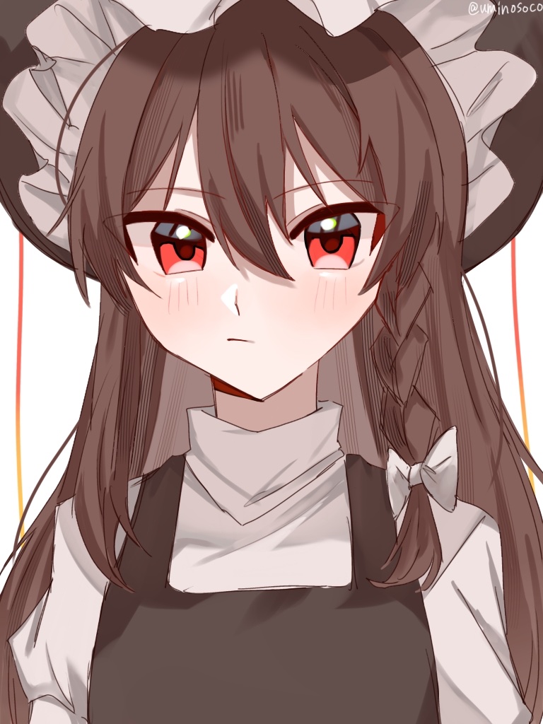 1girl artist_name black_dress black_hat bow braid commentary cosplay dress expressionless frilled_hat frills hair_between_eyes hair_bow hakurei_reimu hat kirisame_marisa kirisame_marisa_(cosplay) long_hair looking_at_viewer pinafore_dress red_eyes shirt side_braid sleeveless sleeveless_dress solo untranslatable_commentary touhou uminosoco upper_body white_bow white_shirt