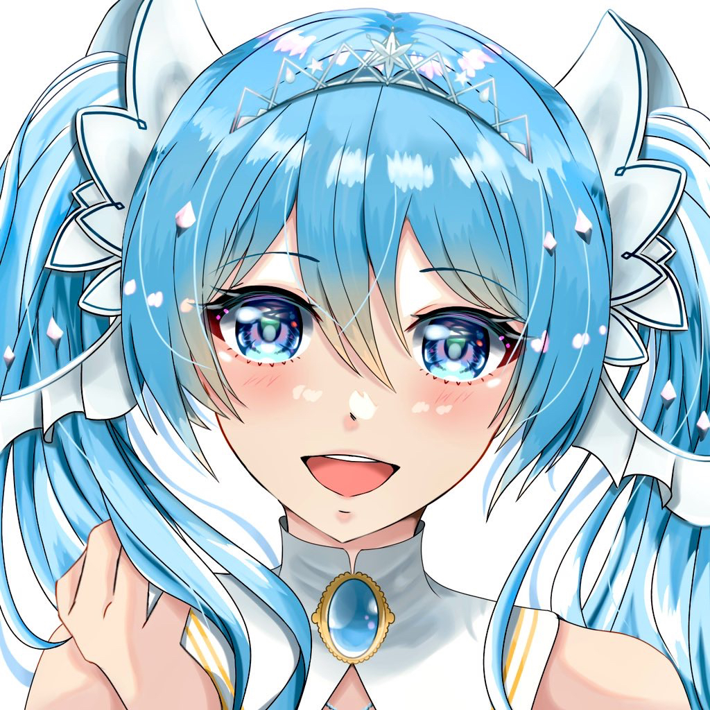1girl blue_eyes blue_hair blush chipmint777 detached_sleeves hair_between_eyes hair_ornament hatsune_miku jewelry long_hair looking_at_viewer official_alternate_costume official_alternate_hairstyle open_mouth simple_background smile solo twintails vocaloid white_background white_tiara yuki_miku yuki_miku_(2019)