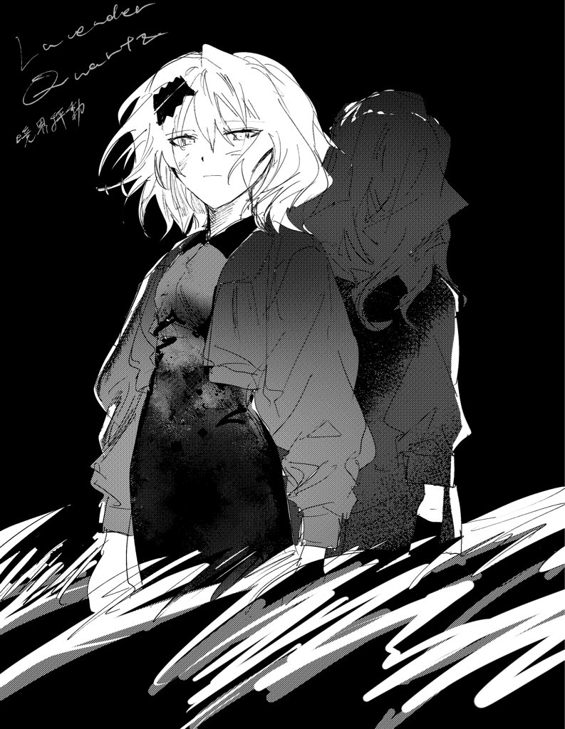 2girls back-to-back black_background cirsium_(lavender_quartz) closed_mouth collared_dress copyright_name dress expressionless facing_away feet_out_of_frame greyscale hair_ornament ikonu_(lavender_quartz) jacket lavender_quartz lavender_quartz:_kyoukai_hyoudou long_hair looking_at_viewer medium_hair monochrome multiple_girls naresaka_menko open_clothes open_jacket screentones simple_background standing