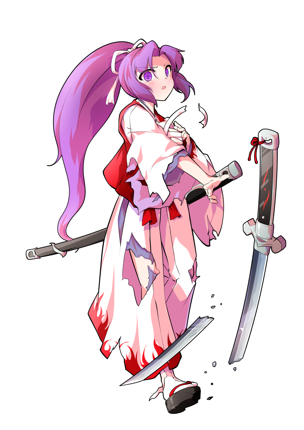 1girl alphes_(style) blush commentary_request dairi defeat full_body hair_ribbon haori high_ponytail highres japanese_clothes katana large_variant_set long_hair long_sleeves meira_(touhou) pants parody ponytail purple_hair red_vest ribbon socks solo style_parody sword tabi tachi-e torn_clothes touhou touhou_(pc-98) transparent_background variant_set vest weapon white_pants white_ribbon white_socks wide_sleeves