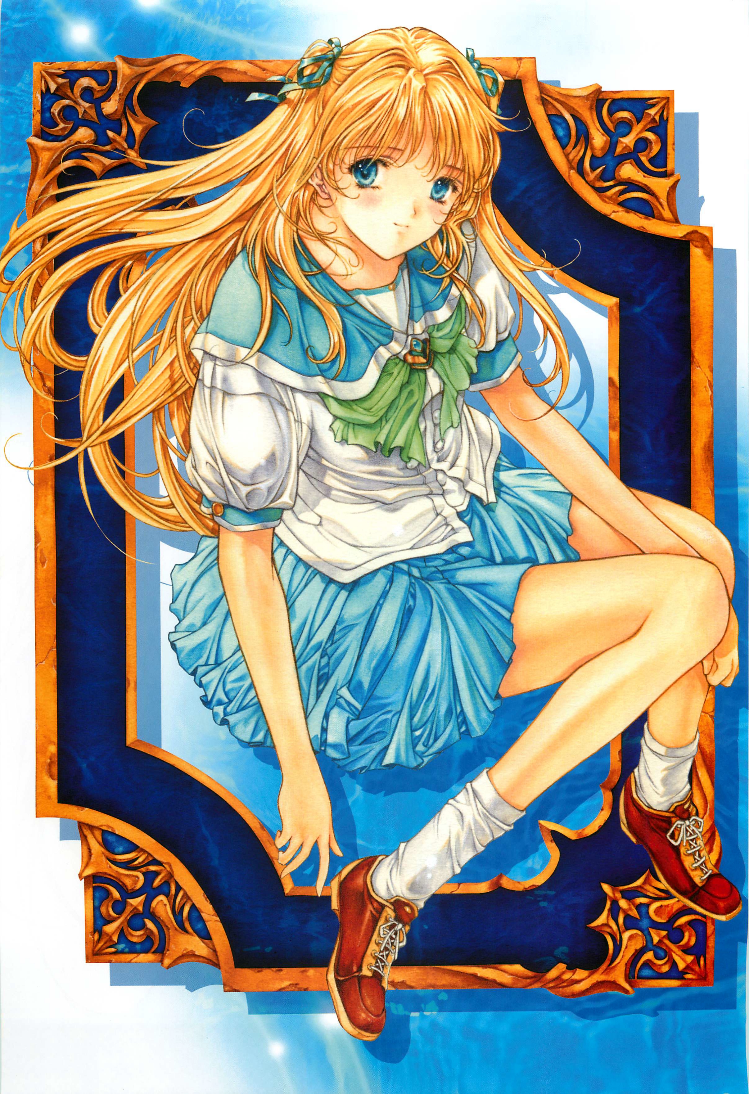 1girl absurdres bare_legs blonde_hair blue_eyes blue_skirt brown_shoes highres honami_yui long_hair looking_at_viewer min-naraken official_art scan school_uniform second-party_source see_in_ao serafuku shirt shoes sitting skirt smile solo white_shirt