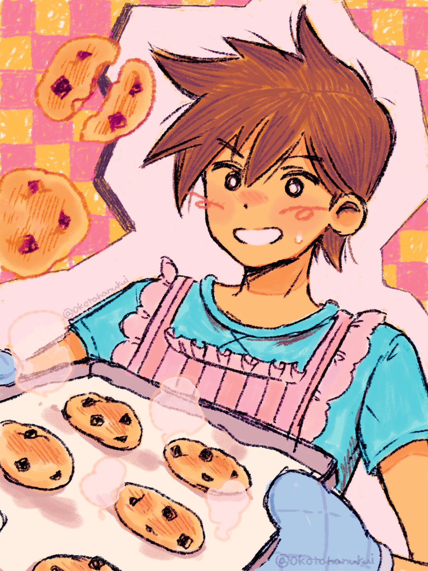 1boy alternate_costume apron black_eyes blue_shirt blush bright_pupils brown_hair chocolate_chip_cookie cookie dark-skinned_male dark_skin food hero_(faraway)_(omori) hero_(omori) highres looking_at_viewer male_focus okotahanukui omori open_mouth oven_mitts pink_apron shirt short_hair short_sleeves smile solo sweatdrop t-shirt twitter_username upper_body white_pupils