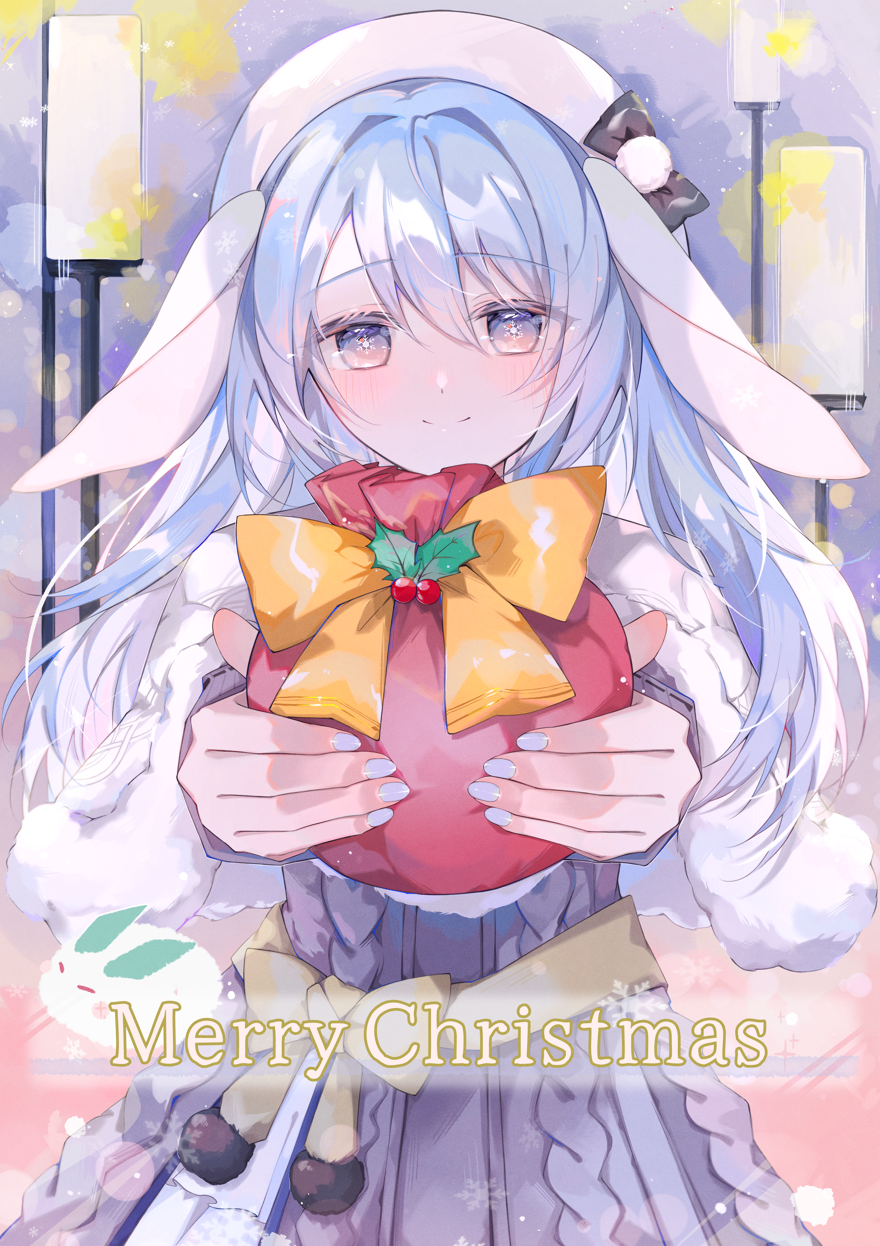 1girl absurdres animal_ears blue_hair blue_nails bow commission gift hat hat_bow highres holding holding_gift indie_virtual_youtuber kasiro_yupia long_sleeves merry_christmas rabbit_ears smile snow_rabbit snowflake_pupils syana_alice virtual_youtuber white_bow yellow_bow