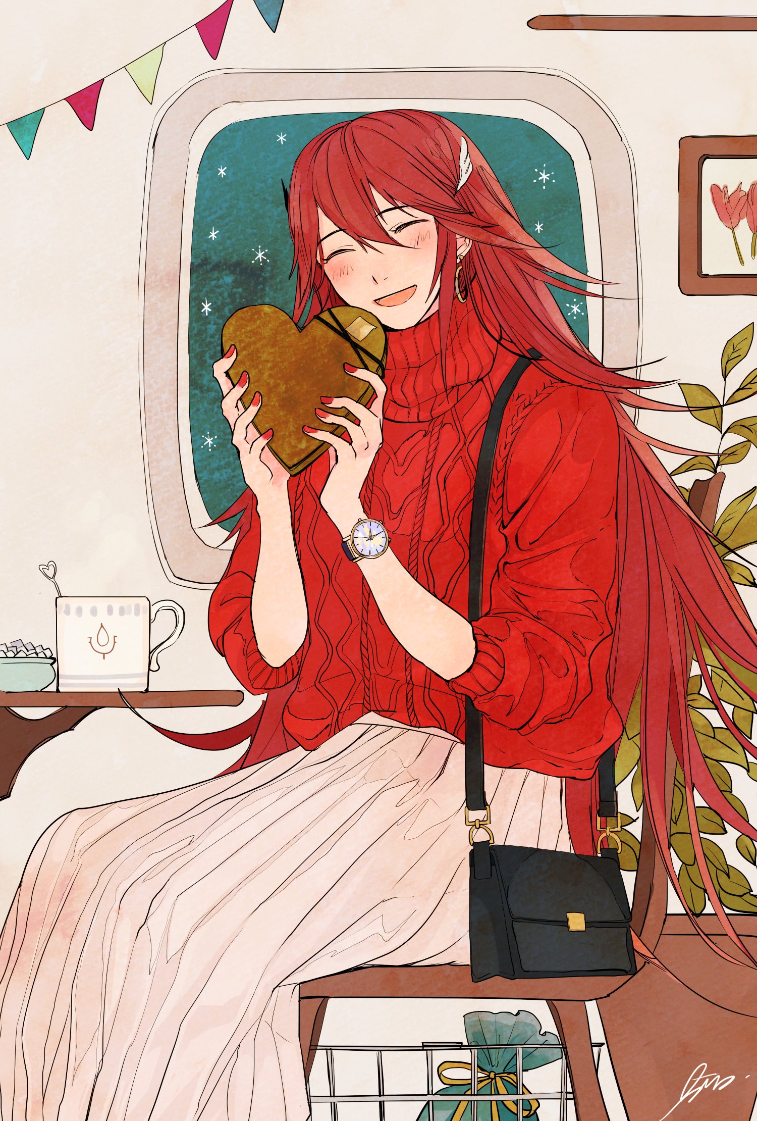 1girl alternate_costume blush candy chair chocolate chocolate_heart closed_eyes commentary_request cordelia_(fire_emblem) earrings fingernails fire_emblem fire_emblem_awakening food heart heart-shaped_food highres indoors jewelry kazuha_(kazuha1003) nintendo on_chair open_mouth red_hair red_nails red_sweater signature skirt smile solo sweater table valentine watch white_skirt window wristwatch