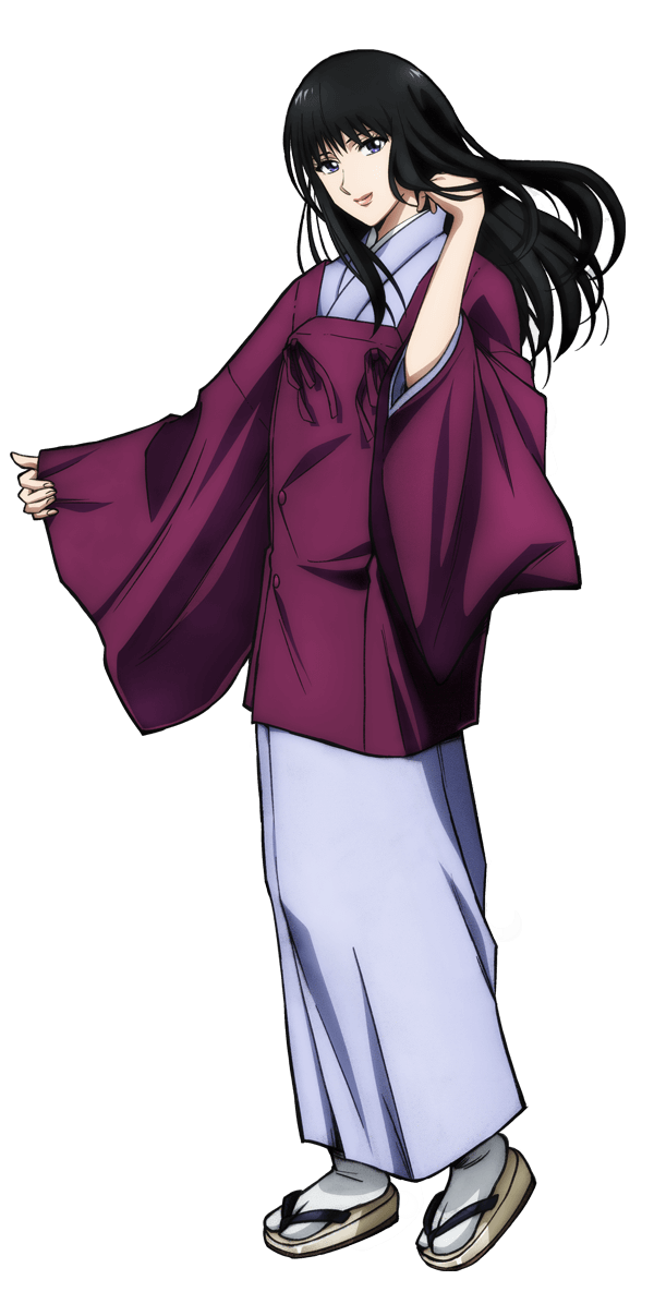 1girl anime_coloring black_hair blue_eyes closed_mouth full_body hand_in_own_hair head_tilt japanese_clothes kimono lips long_hair long_sleeves looking_at_viewer nishii_terumi official_art purple_kimono rurouni_kenshin sandals simple_background smile solo standing takani_megumi transparent_background wide_sleeves zouri
