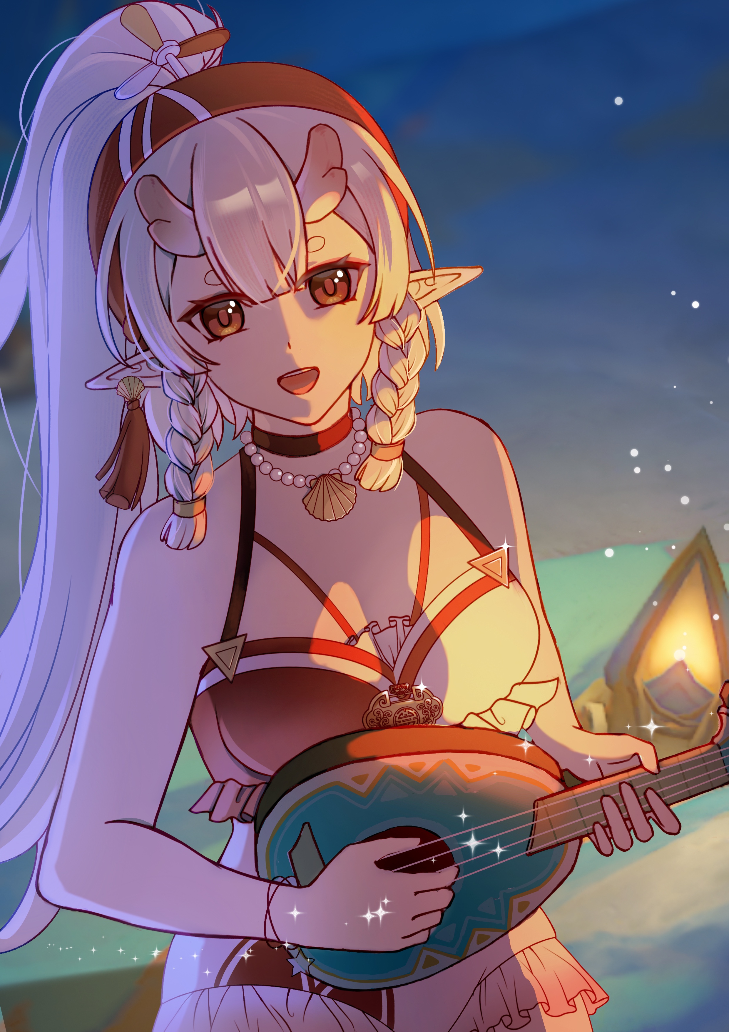 1girl absurdres alternate_costume alternate_hairstyle bell bikini braid breasts brown_eyes cleavage dragon_horns earrings eastern_dragon_horns high_ponytail highres holding holding_instrument horns instrument jewelry long_hair looking_at_viewer medium_breasts music necklace open_mouth original pearl_necklace playing_instrument pointy_ears ponytail qixian short_eyebrows single_earring smile solo swimsuit tassel tassel_earrings tianye_yuan twin_braids very_long_hair white_hair