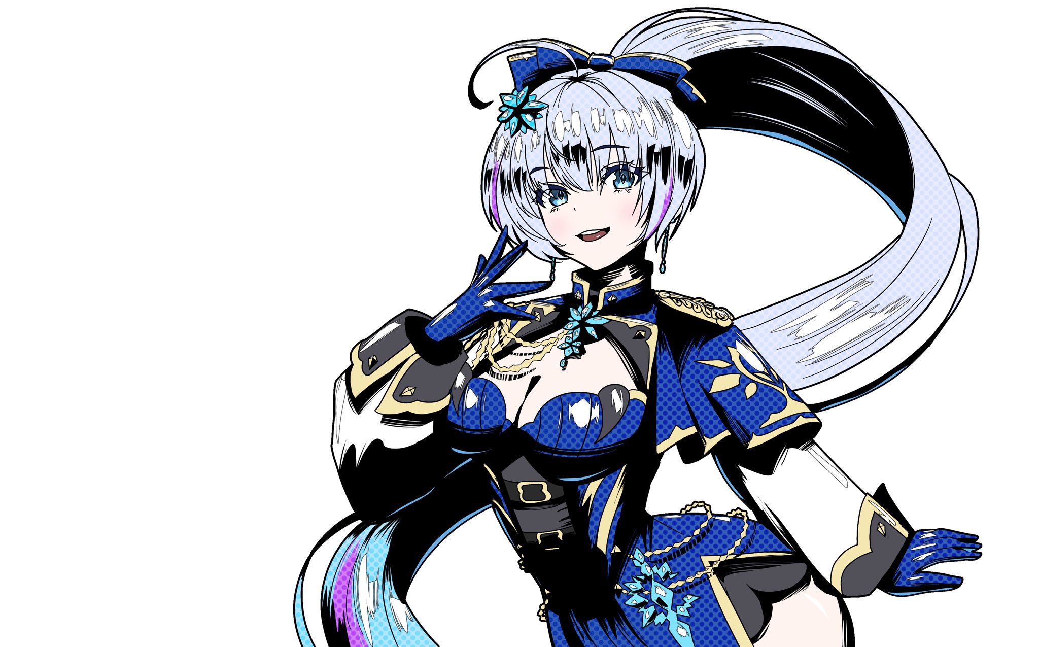 ahoge blue_capelet blue_eyes blue_gloves breasts capelet center_opening cleavage commission flower gloves hair_flower hair_ornament highres indie_virtual_youtuber kennymuseum large_breasts long_hair long_sleeves looking_at_viewer open_mouth ponytail skeb_commission smile soma_nahiro virtual_youtuber white_hair white_sleeves