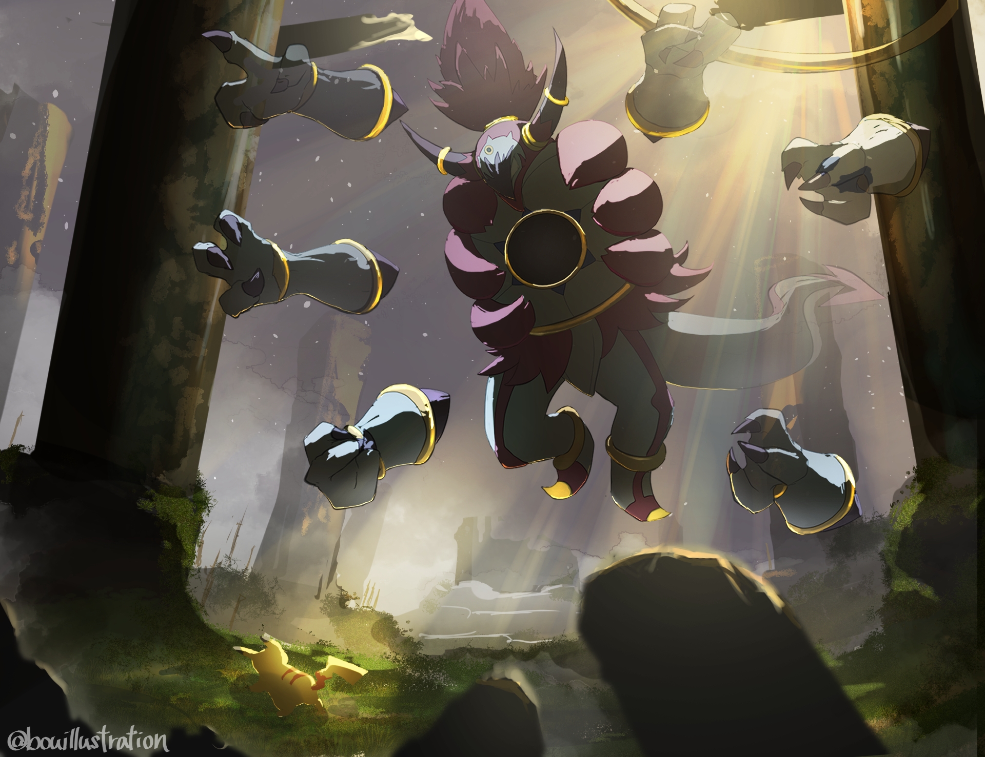 bo_(bouillustration) claws commentary_request floating gen_1_pokemon gen_6_pokemon grass highres holding_hoop hoopa hoopa_(unbound) legendary_pokemon light_rays moss mythical_pokemon nintendo outdoors pikachu pokemon pokemon_(creature) pokemon_focus tree twitter_username watermark