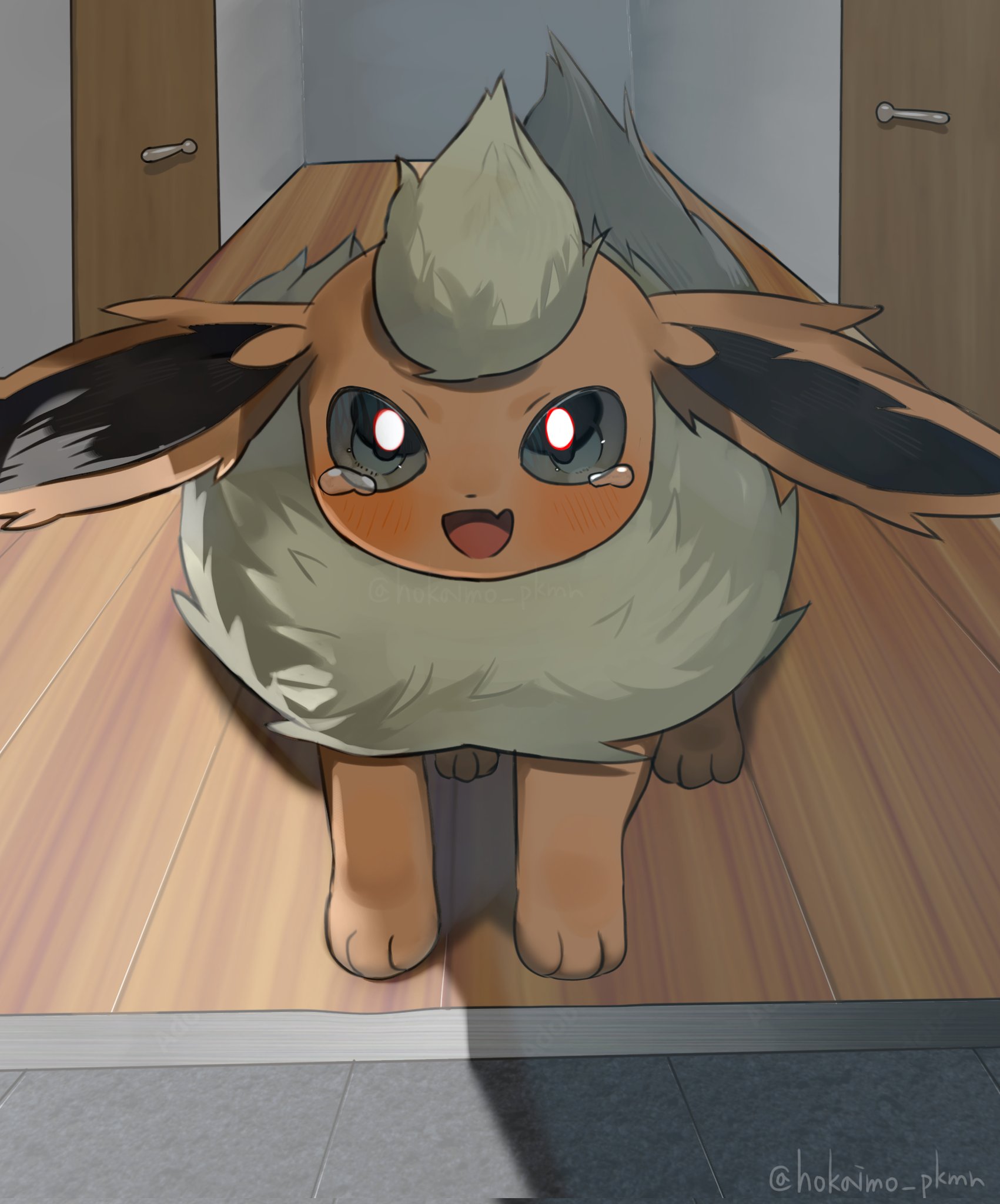 animal_focus blush flareon floor full_body gen_1_pokemon highres hokaimo_pkmn indoors looking_at_viewer nintendo no_humans open_mouth pokemon pokemon_(creature) pokemon_focus smile tail tearing_up tears wooden_floor