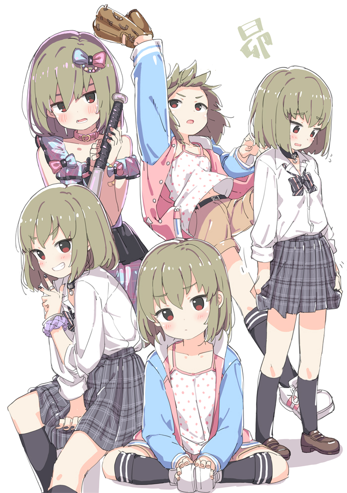 1girl arm_up baseball_bat baseball_glove belt black_belt black_bow black_bowtie black_choker black_dress black_skirt black_socks blue_bow blue_dress blue_jacket bow bowtie brown_shoes brown_shorts camisole choker collared_shirt commentary_request concept_gyarus_(idolmaster) dress green_hair hair_bow holding holding_baseball_bat idolmaster idolmaster_million_live! idolmaster_million_live!_theater_days jacket kuresuku_(lessons) loafers medium_hair multicolored_dress multicolored_jacket multiple_views nagayoshi_subaru official_alternate_costume open_clothes open_jacket pink_bow pink_choker pink_dress pink_jacket polka_dot_camisole red_eyes school_uniform shirt shoes shorts skirt sneakers socks two-tone_bow two-tone_jacket white_camisole white_shirt white_shoes