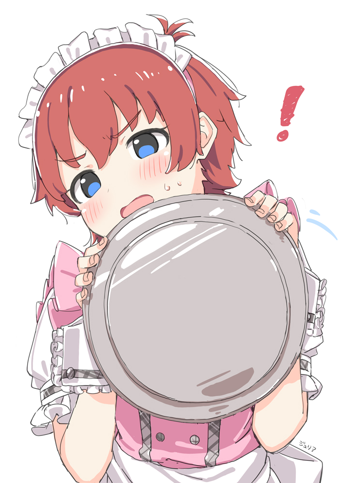 ! 1girl apron blue_eyes commentary_request dress embarrassed frilled_wrist_cuffs frills holding holding_plate idolmaster idolmaster_million_live! julia_(idolmaster) kuresuku_(lessons) maid maid_headdress open_mouth pink_dress plate pretty_waitress_(idolmaster) puffy_short_sleeves puffy_sleeves red_hair short_hair short_sleeves solo upper_body v-shaped_eyebrows white_apron white_background white_sleeves white_wrist_cuffs wrist_cuffs